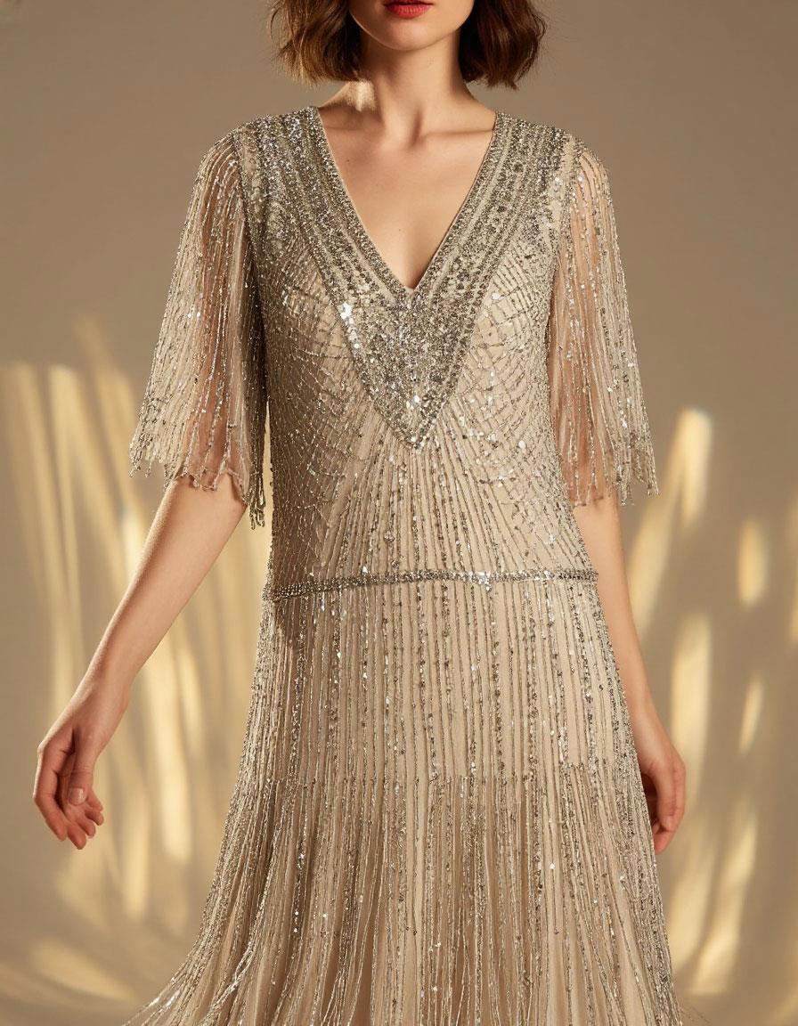 И треугольный вырез — смелый, открывающий ключицы, но не вульгарный. Он был окантован той же бисерной сетью, будто оборванной неведомой рыбиной — концы свисали, повторяя геометрию выреза. И та же сияющая бахрома едва прикрывала щиколотки, спускаясь поверх основы возмутительной длины — лишь до середины икры.