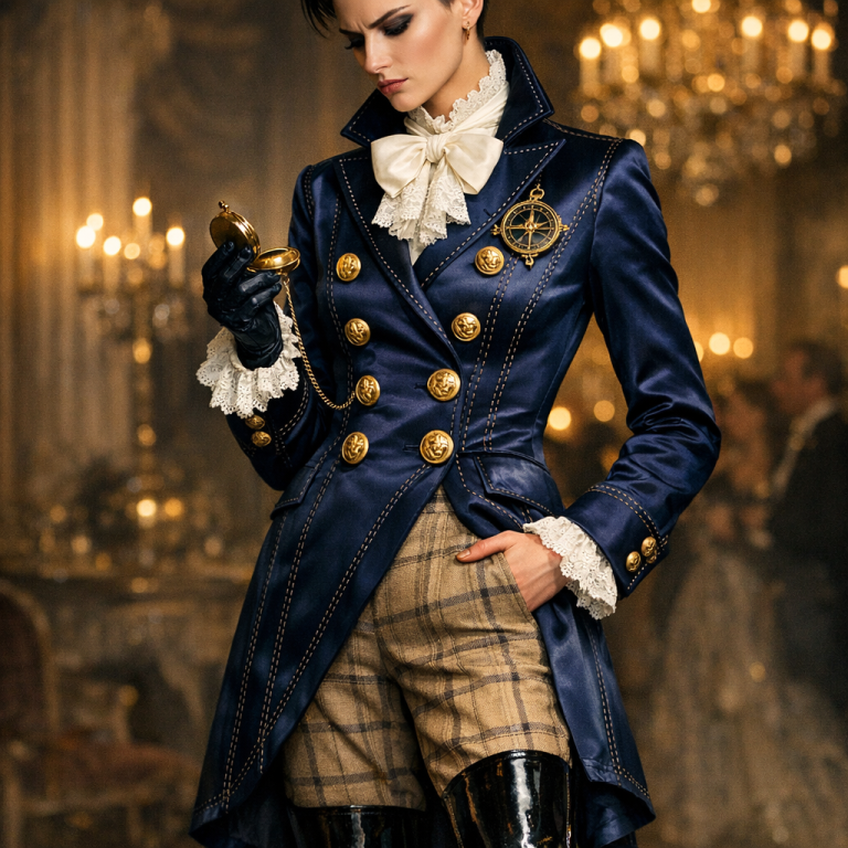 Синий мужской сюртук — отсылка к морю и серьёзным делам. Белый бант — открытость, чистота помыслов и приглашение. Золото пуговиц — заявление о богатстве и надёжности. Чёрные ботфорты — уверенность и деловитость. Бежевый цвет брюк и перекликающаяся строчка на атласе — готовность к уступкам и переговорам.