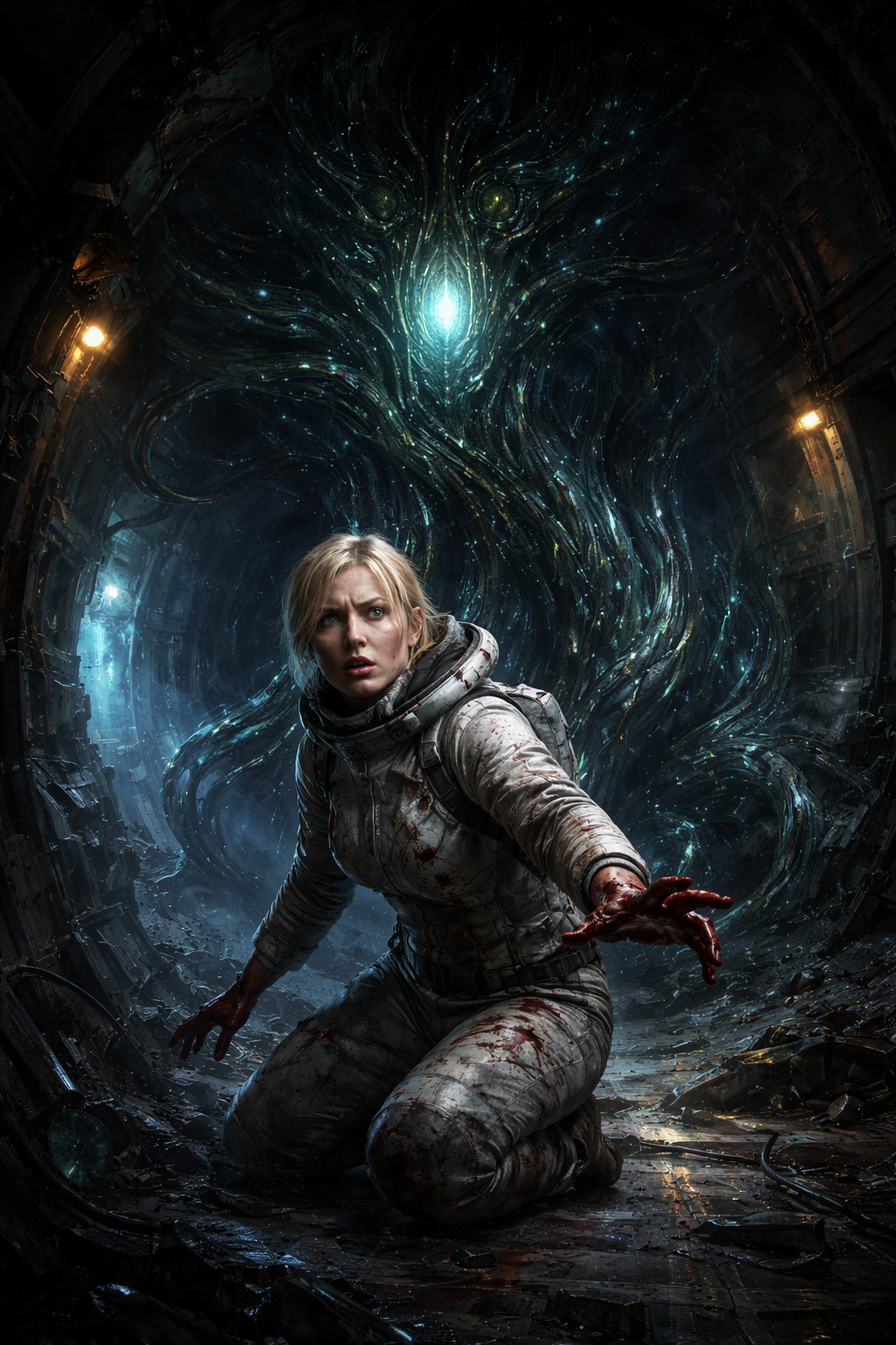 Вот с обложкой затык. ЖэПэТэ без подсказок рандомно слепил мне шаблонную, скучную и непонятную (Ингрид красива там - да). А по моим заготовкам одна только хрень. Не умеет жестянка в спираль из скафандров, вот таканьки.