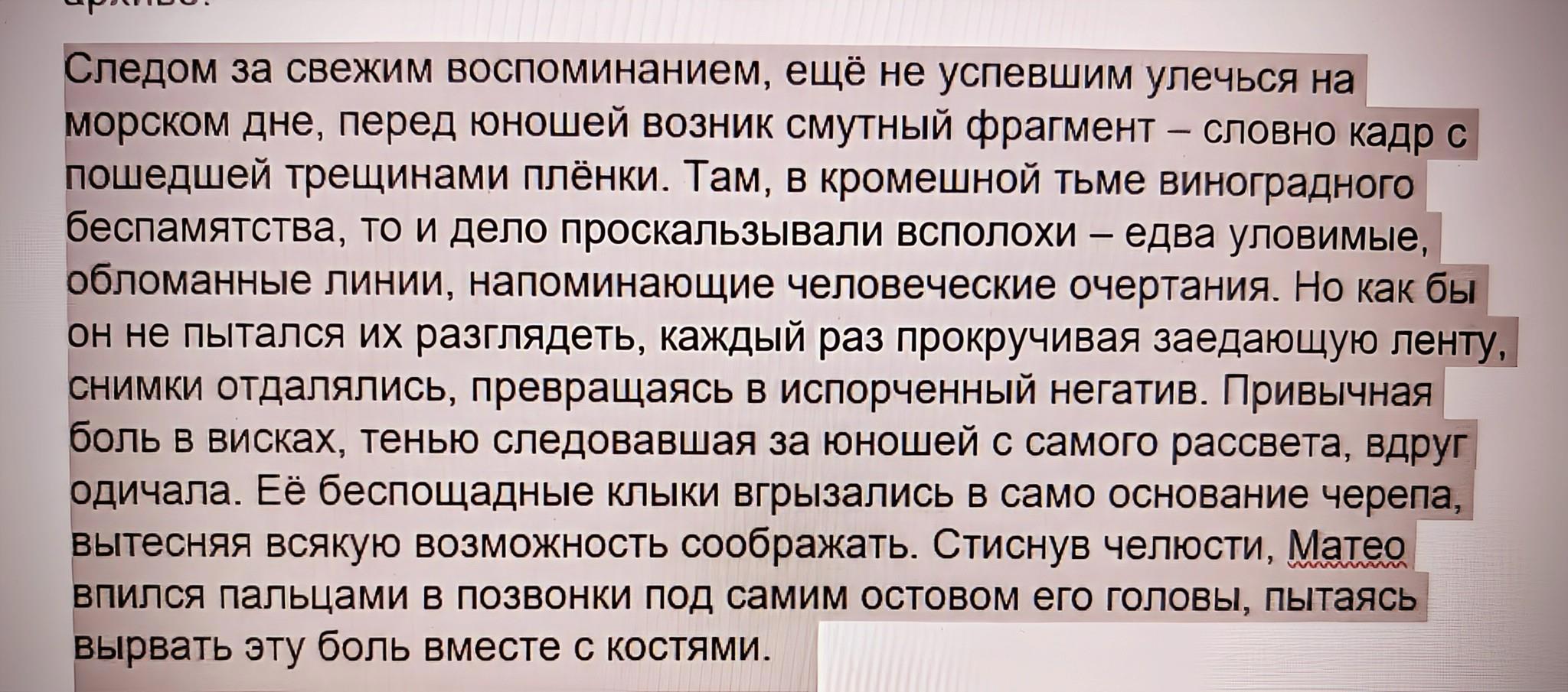 В этом фрагменте я хотела передать состояние Матео через физические ощущения. Когда ментальная пытка переходит в настоящую мигрень, а воспоминания кажутся испорченным негативом, который невозможно проявить.