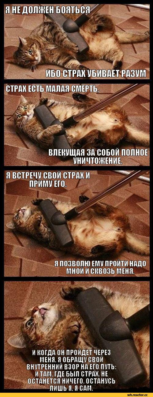 Я не должен бояться. Ибо страх убивает разум. Страх есть малая смерть, влекущая за собой полное уничтожение. Я встречу свой страх и приму его. Я позволю ему пройти надо мной и сквозь меня. И когда он пройдет через меня, я обращу свой внутренний взор на его путь; и там, где был страх, не останется ничего. Останусь лишь я, я сам.