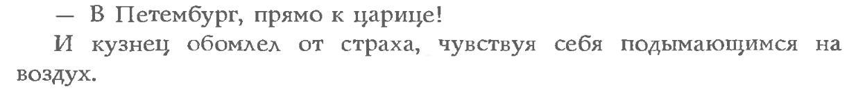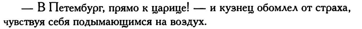 — В Петембург, прямо к царице! — и кузнец обомлел от страха, чувствуя себя подымающимся на воздух.