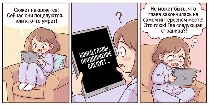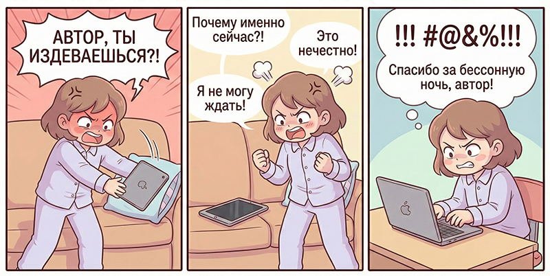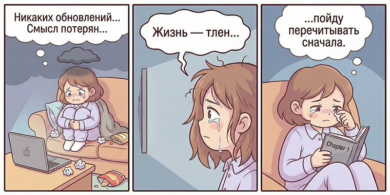 Признавайтесь в комментариях, на какой стадии сейчас находитесь вы в ожидании любимых книг? Будем страдать вместе (пока я пытаюсь понять, где тут кнопка «ответить на комментарий»).