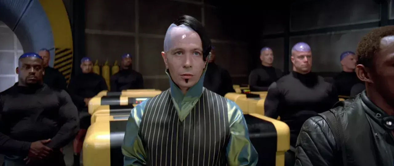 В общем, в данном фильме используется так называемая "корпоративная" одежда: каждый условный босс и его свита одеты в одном стиле. Президент и его окружение, генерал и военные, полицейские, священник и его послушник, матросы, Руби Рот и его подхалимы и - сейчас фанфары! - Зорг и его команда! Это не бросается в глаза, однако, если обращать внимание, то заметишь, что он далеко не единственный, кто носит пластиковые нашлёпки на голове. В его свите есть и другие "модники" прикрыть выбритые места. Некоторые так даже с синим оргстеклом на лысине расхаживают.