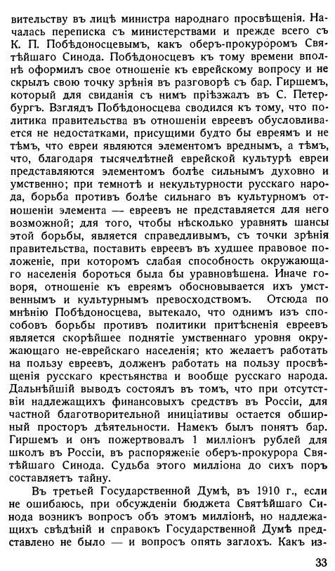 Автор: fales"Взглядъ Побѣдоносцева сводился къ тому, что политика правительства въ отношеніи евреевъ обусловливается не недостатками, присущими будто бы евреямъ и не тѣмъ, что евреи являются элементомъ вреднымъ, а тѣмъ, что, благодаря тысячелѣтней еврейской культурѣ евреи представляются элементомъ болѣе сильнымъ духовно и умственно; при темнотѣ и некультурности русскаго народа, борьба противъ болѣе сильнаго въ культурномъ отношеніи элемента — евреевъ не представляется для него возможной; для того, чтобы нѣсколько уравнять шансы этой борьбы, является справедливымъ, съ точки зрѣнія правительства, поставить евреевъ въ худшее правовое положеніе, при которомъ слабая способность окружающаго населенія бороться была бы уравновѣшена. Иначе говоря, отношеніе къ евреямъ обосновывается ихъ умственнымъ и культурнымъ превосходствомъ."