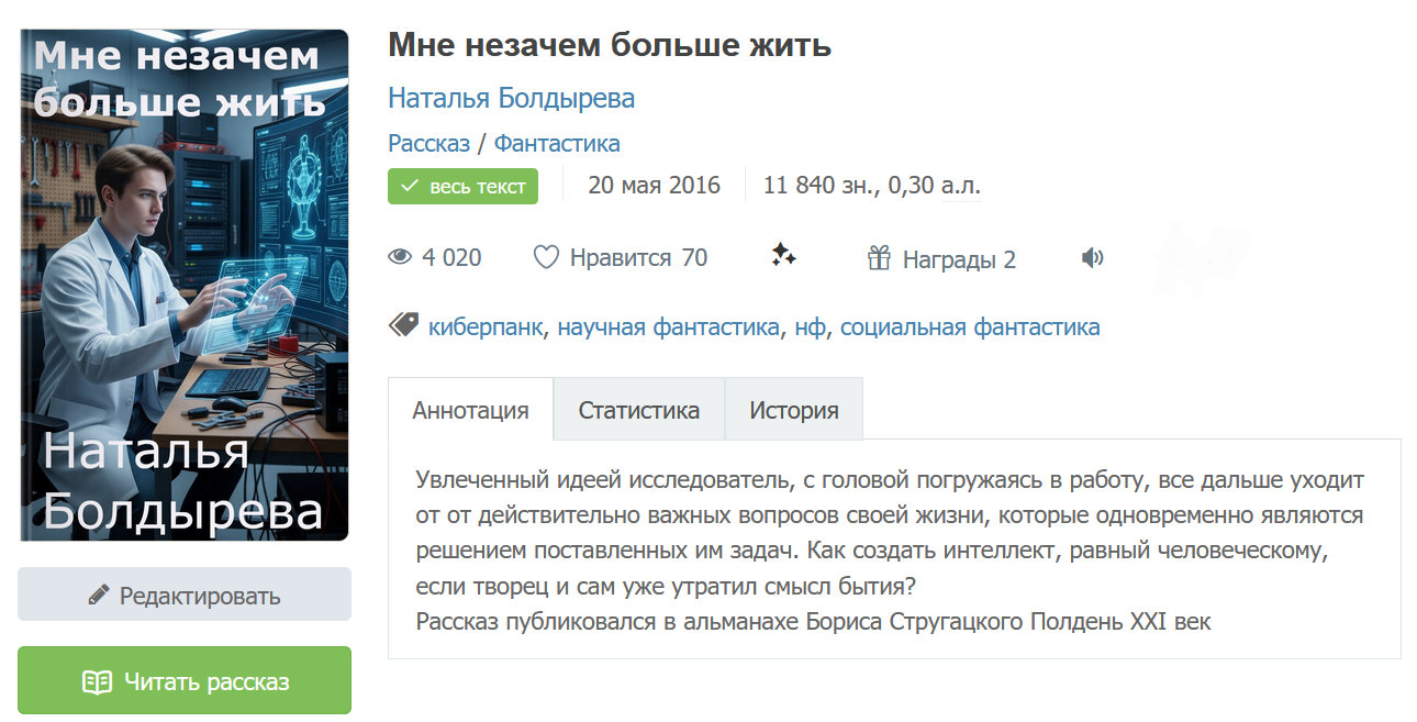 Автор: Наталья БолдыреваОдин из лучших - и, кстати, самых коротких - моих рассказов сменил обложку. И всё благодаря Михаилу Суханову, который искал рассказы для подборок в своем телеграмм сообществе (подробности тут). Рассказ Михаилу настолько понравился, что он не просто включил его в подборку, но и сгенерировал для него подходящую к сути рассказа обложку (до сего дня обложкой рассказу служила обложка журнала "Полдень", в котором этот рассказ был некогда опубликован).