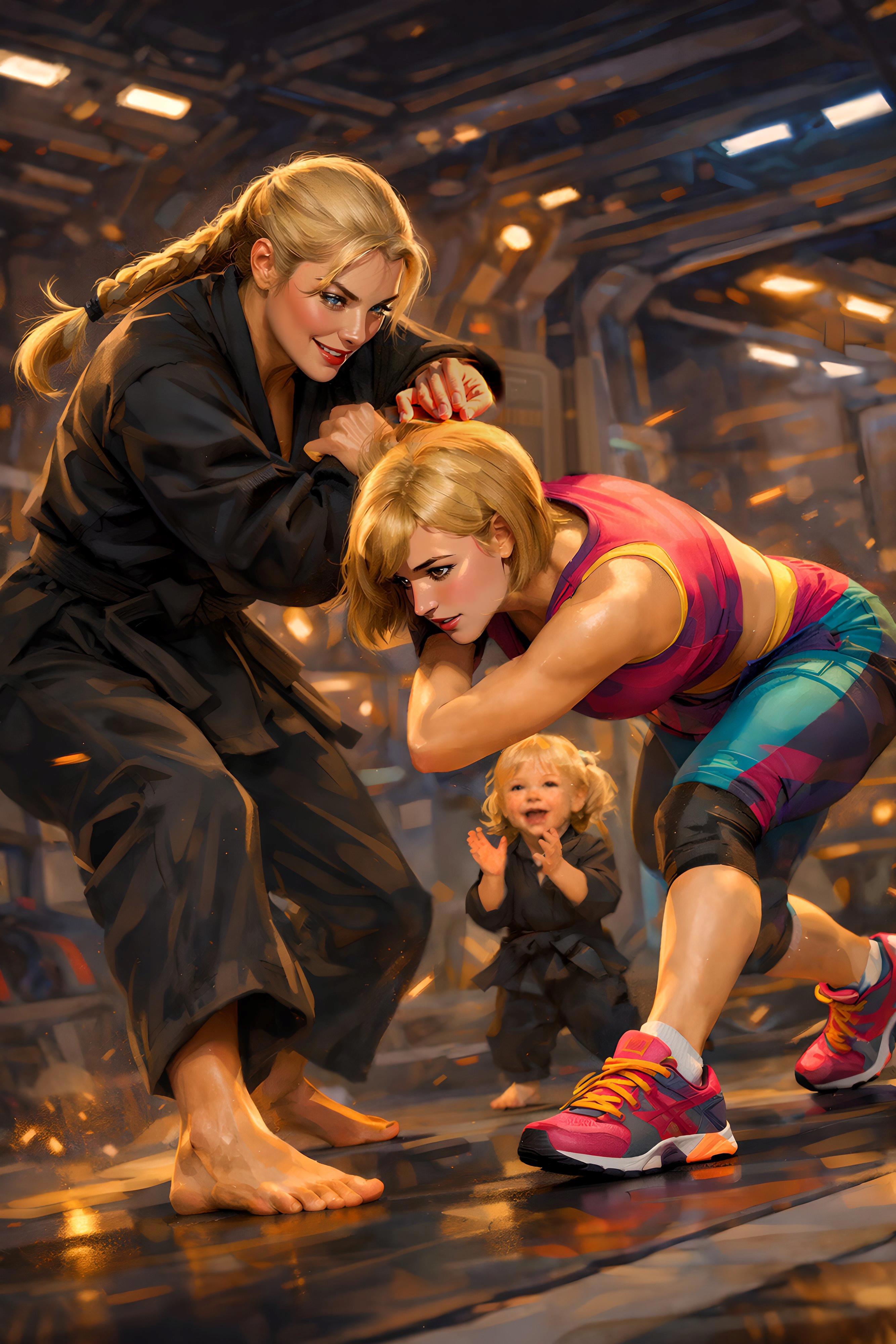 Автор: Мадоши ВарвараТут сразу получилось хорошо, только лица потребовалось переделать в Stable Diffusion. Но чатгпт затупил с руками, SD тоже, я корячилась и чуть ли не вручную их перерисовывала. Встречайте маму с дочурами.