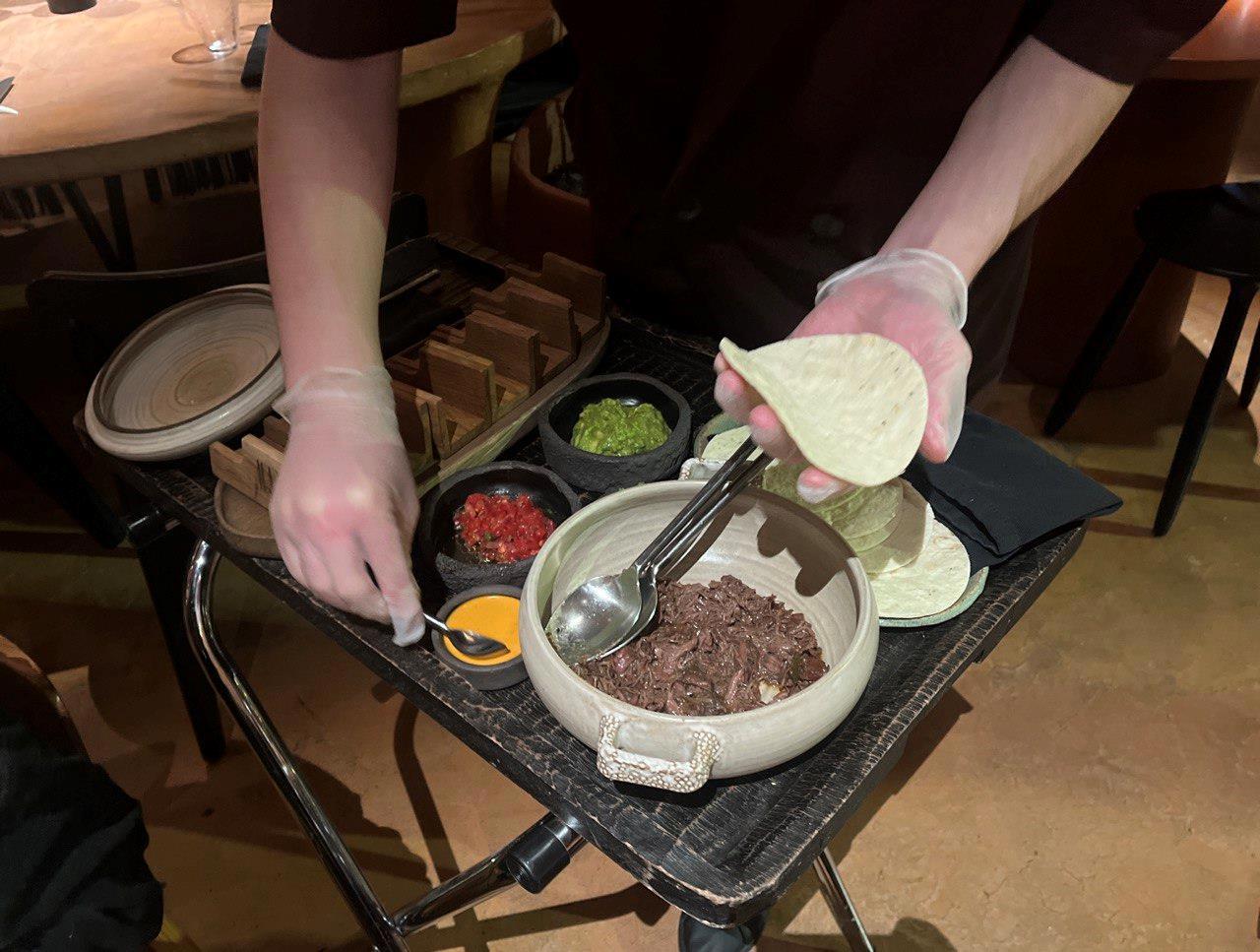 Самым вкусным впечатлением вечера оказалось тако с телячьими щечками. Их готовили прямо при нас на специальном раскладном столике.