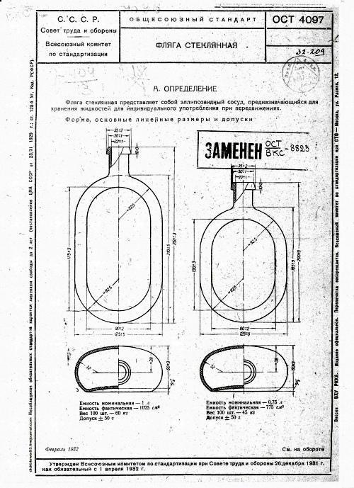 В 1932 году на снабжение РККА наравне с флягами из алюминия, латуни или жести, были приняты и водоносные фляги из стекла, объемом 0,75 л. и 1 л. Стеклянные фляги выпускались из различного по цвету стекла в зависимости от применяемого сырья. Они имели ёмкость 0,75 л и 1 л. Стеклянная фляга ёмкостью 0,75 л. весила 450 граммов, литровая на 80 грамм больше. Горлышко затыкалось, как правило, резиновой пробкой.