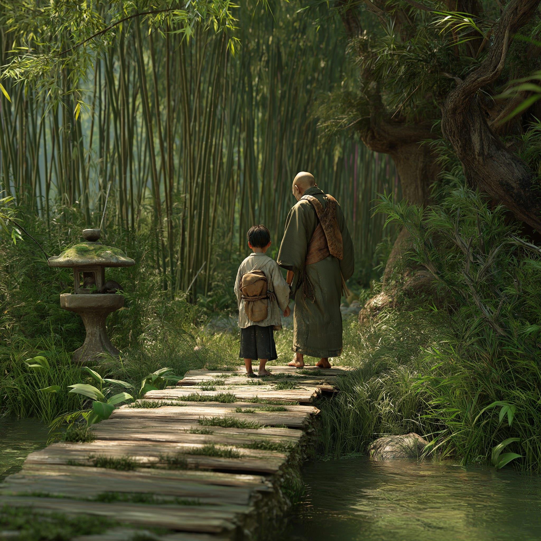 В этот момент из-за поворота тропы показались две фигуры: сгорбленный старик в выцветшем монашеском одеянии и мальчик-послушник, почтительно поддерживающий его под руку.