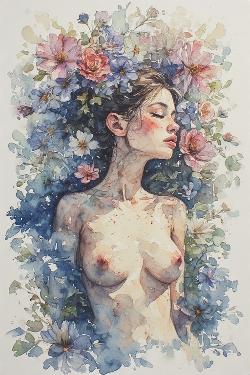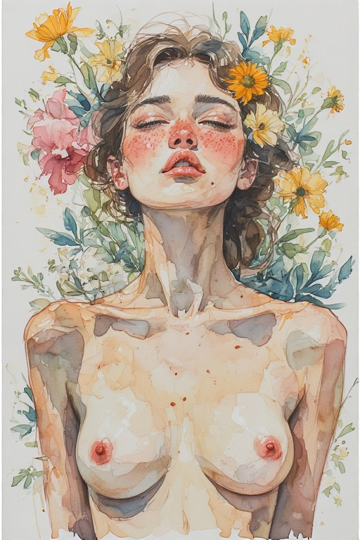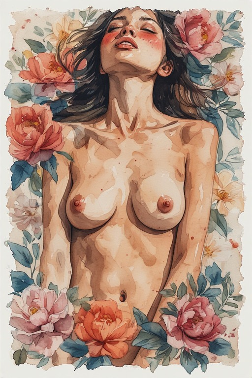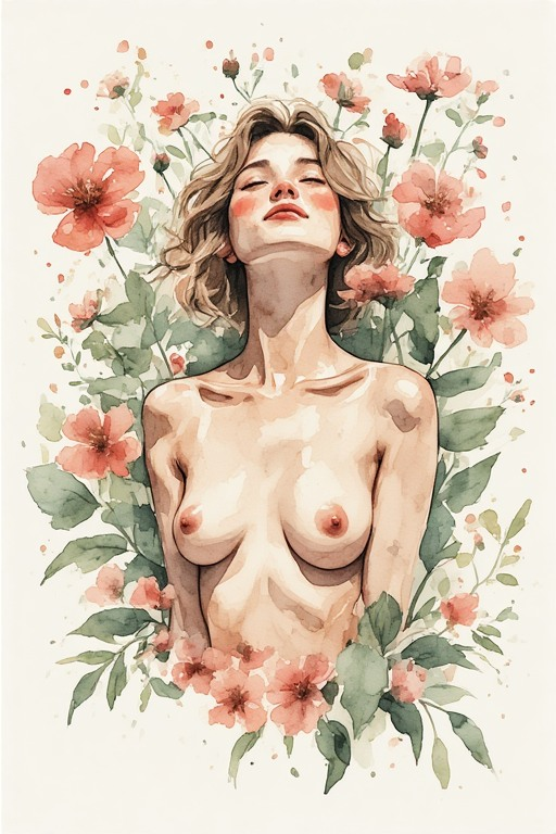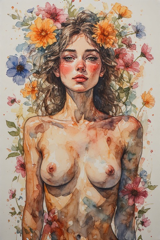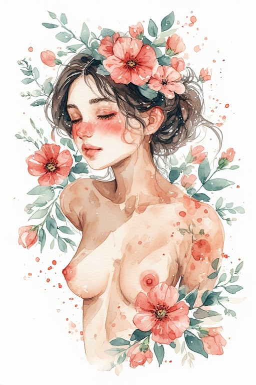 Naked woman, blush, naked breasts, nipples, flowers, watercolor