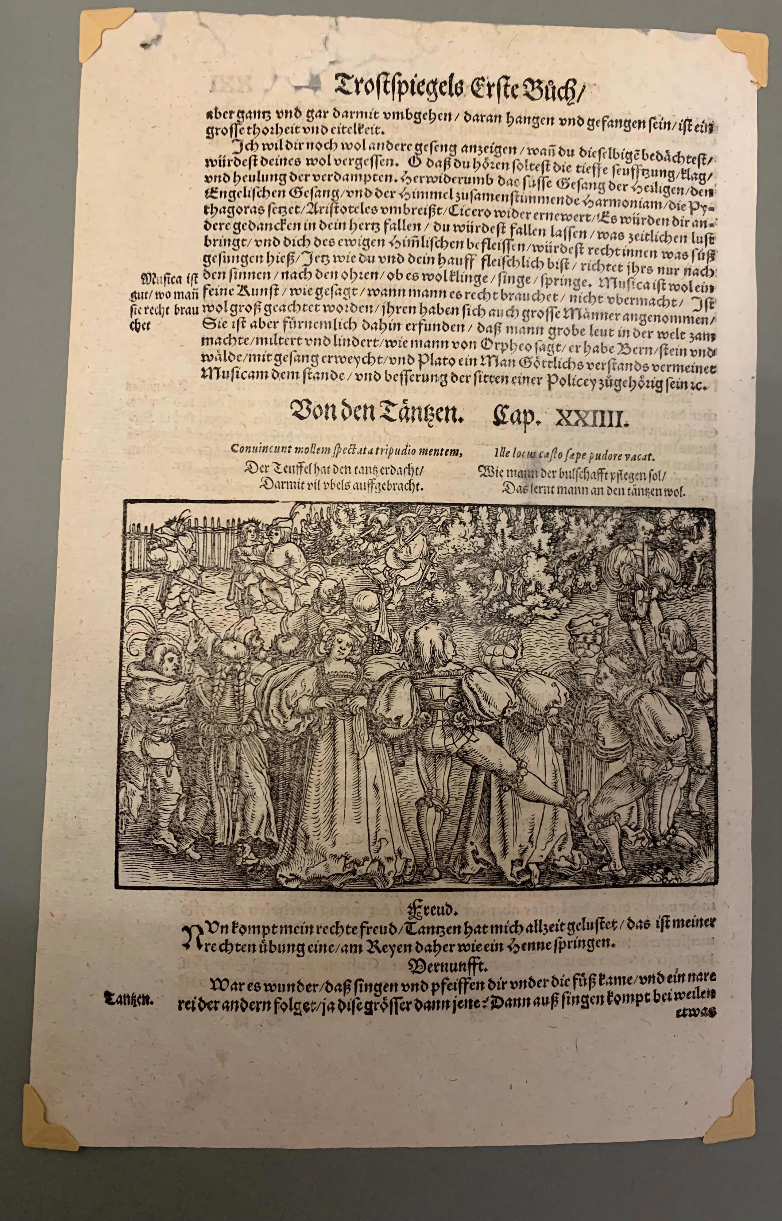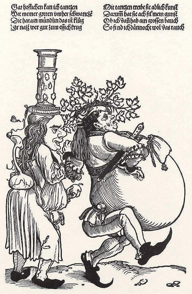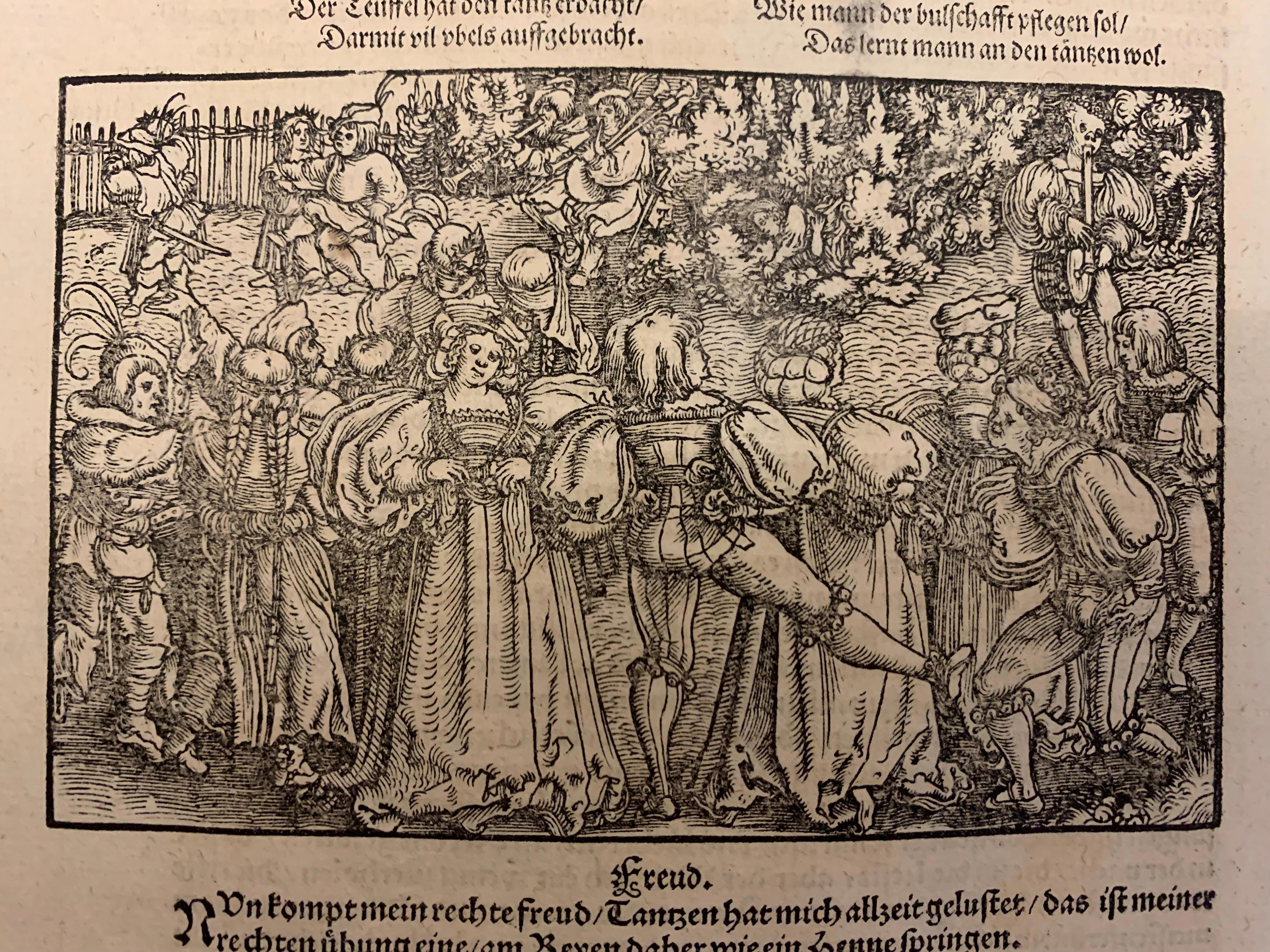 Гравюра сопровождается нравоучительными стихами на старонемецком языке. Верхние строки гласят, что «Дьявол придумал танец», принося тем самым много зла, и что через танцы люди учатся «ухаживаниям» (в сомнительном смысле). В нижней части персонаж по имени «Радость» (Freud) говорит о своем желании танцевать и прыгать «как курица» в хороводе.