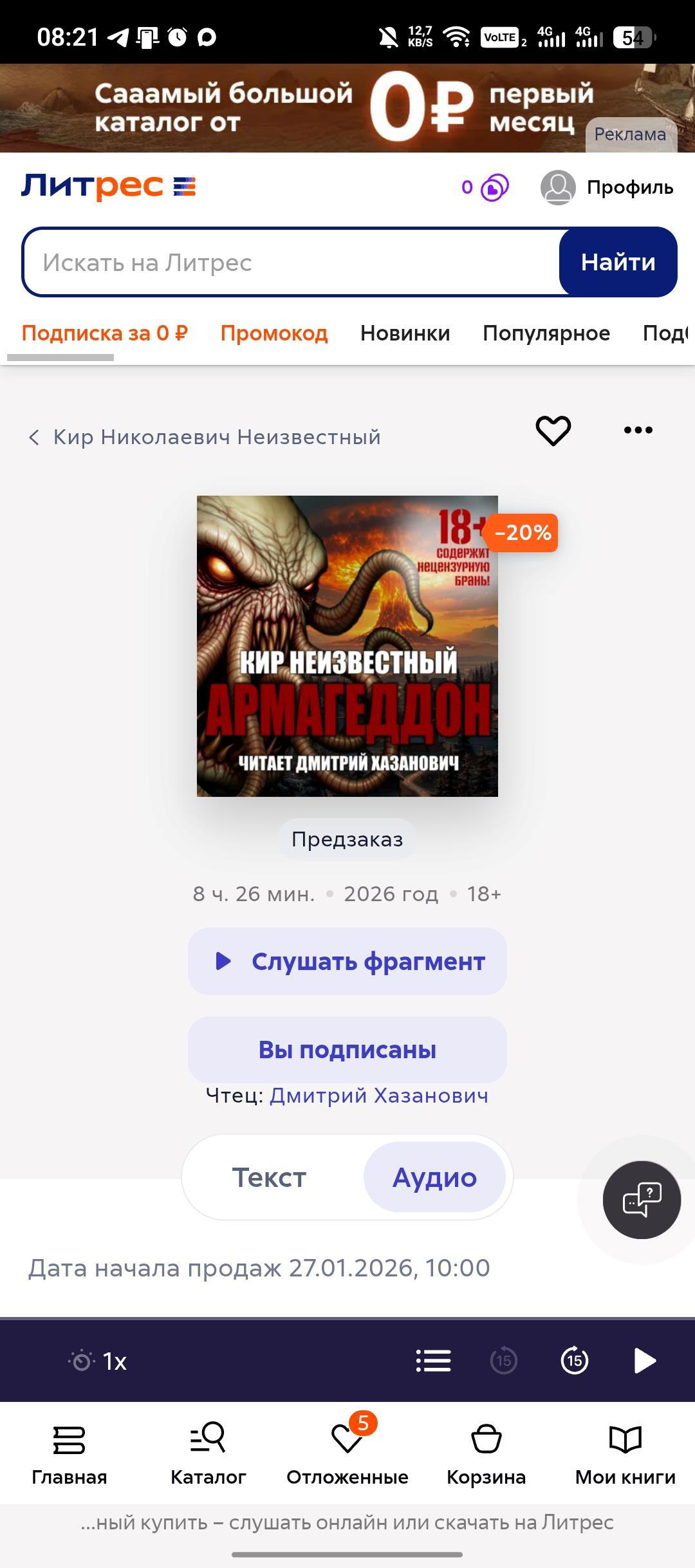 Автор: Кир НеизвестныйКнига присутствует на ресурсе в электронном виде, в бумажном виде и аудиоформате. Причем озвучка от ТОП 10 России среди чтецов - Дмитрия Хазановича. Я говорю, конечно, о "Армагеддон. Коллекция".