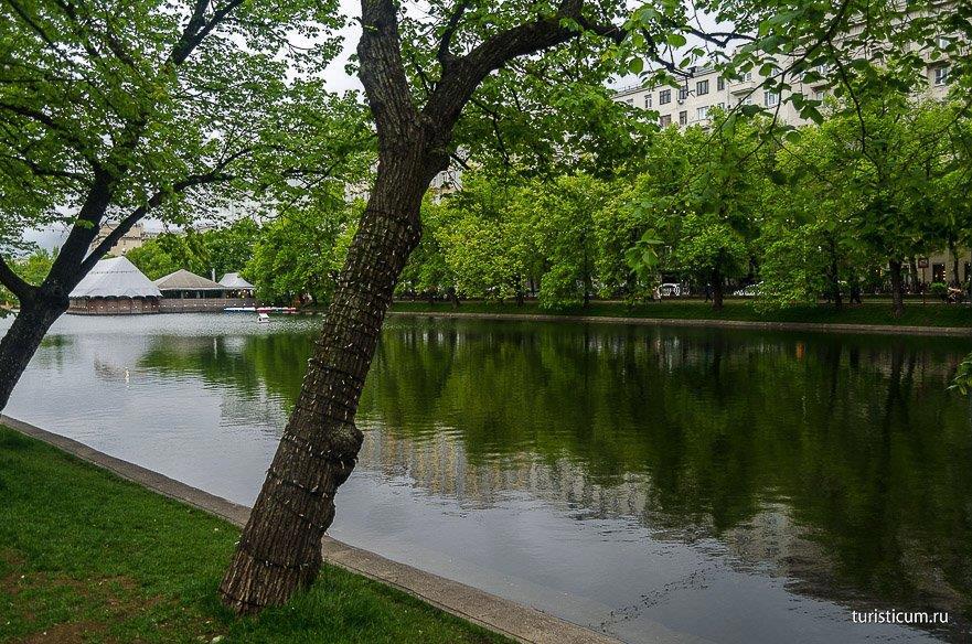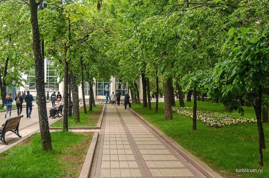 Помимо широкой главной аллеи есть еще тихая боковая, отделенная газоном, который усажен группами деревьев и кустов. Обе аллеи выходят на большую площадку около пруда.