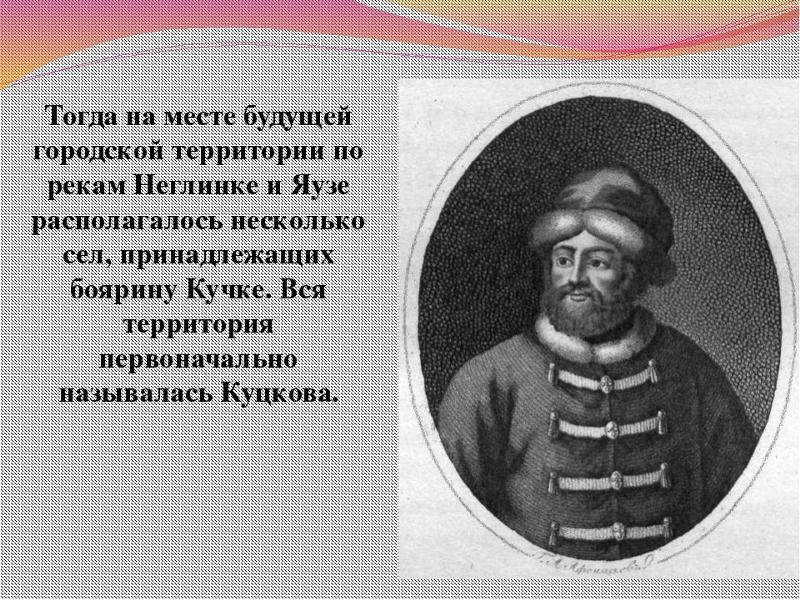 Род Кучковичей был очень богат, почти ничем не уступая Владимирским и Суздальским князьям, и это, само собой, не могло не вызвать их зависть. По легенде, когда князь Юрий Долгорукий проезжал через эти места, боярин Кучка встретил его, однако, как показалось князю, не оказал ему надлежащих почестей. И тогда князь приказал зарезать боярина.