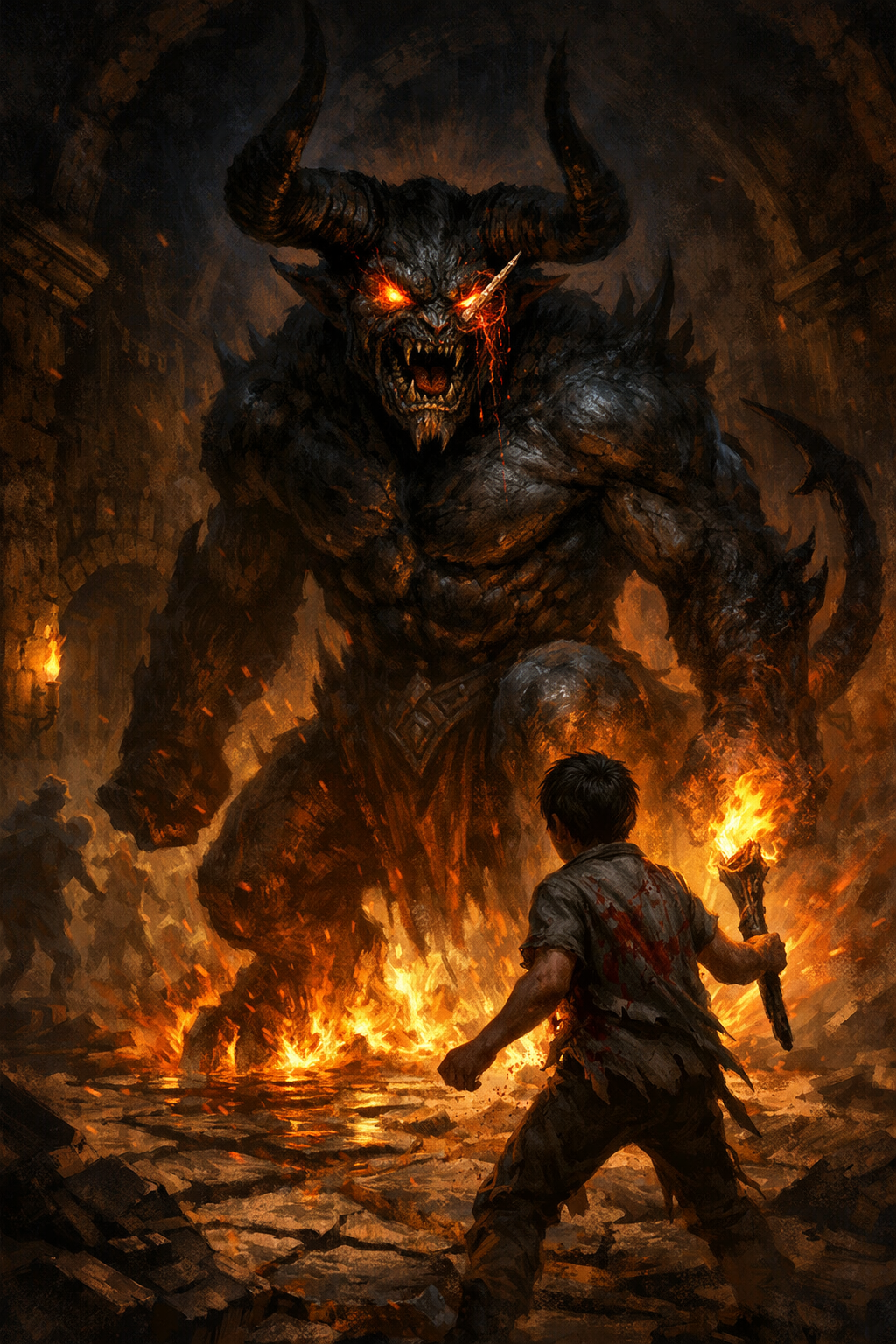 Алеша стоял один против чудовища. Мальчишка – худой, взъерошенный, с рваной рубахой, испачканной кровью. Он выглядел таким маленьким на фоне громады демона, но глаза горели упрямым светом.