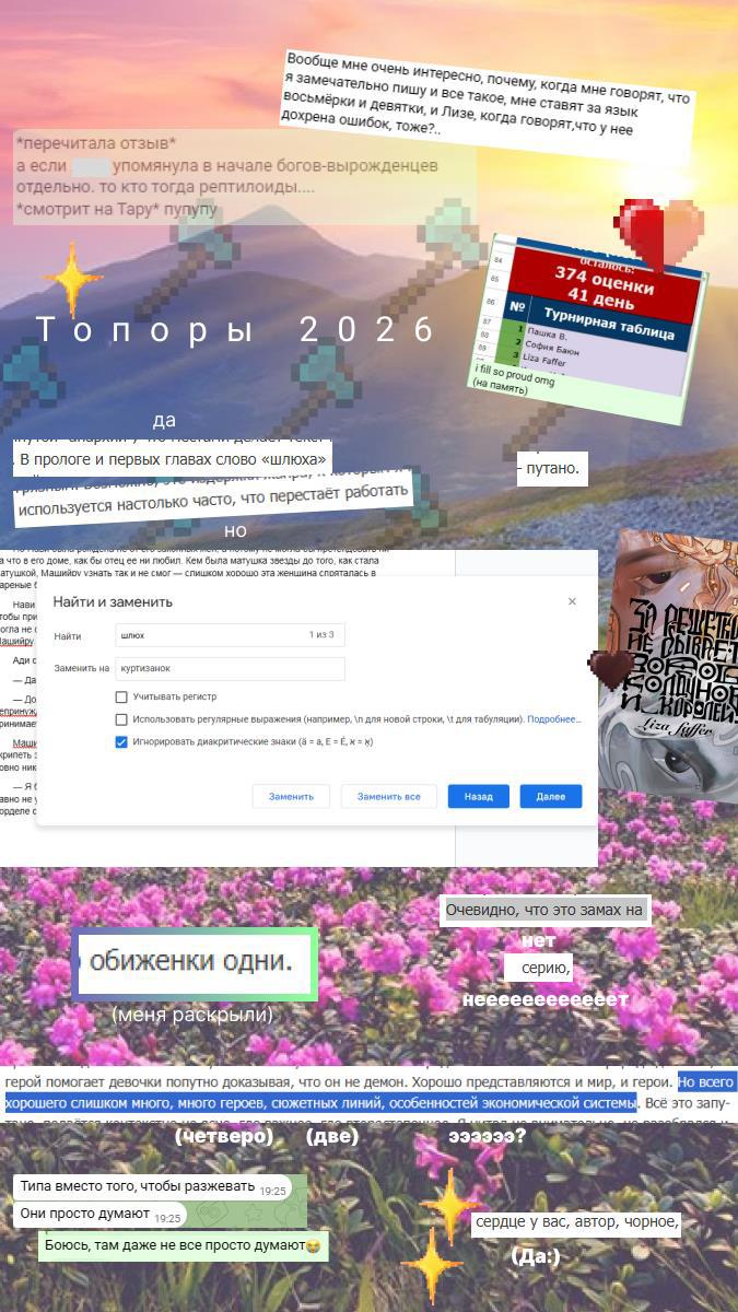Моей же святой целью было выяснить, насколько внятно идет повествование, возможно ли там вообще следить за событиями и не травмирует ли оно людей или все же надо прекращать пить во время работы с текстом. К счастью, подавляющее большинство рецензентов не только все поняло, но и наговорило мне много приятных слов, я не ожидала) Кто-то даже сказал, что было интересно, чему я очень обрадовалась, потому что в душе не чаю, как складывать события по-другому.