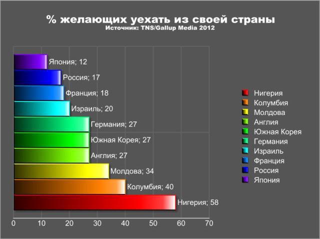 Автор: Михаил Поляков1) Смотря на диаграмму, вспоминается мудрость «хорошо там, где нас нет». Плюс, что тяга к перемене мест — она интернациональна и вызвана во многом желанием получить новые впечатления и вырваться из рутины. Данные от 2012 года, попались как-то совершенно случайно. Несколько раз пробовал найти более свежие, но нет. Прям ощущение, что специально блокируют информацию и всё заваливают данными о желающих эмигрировать из России.
