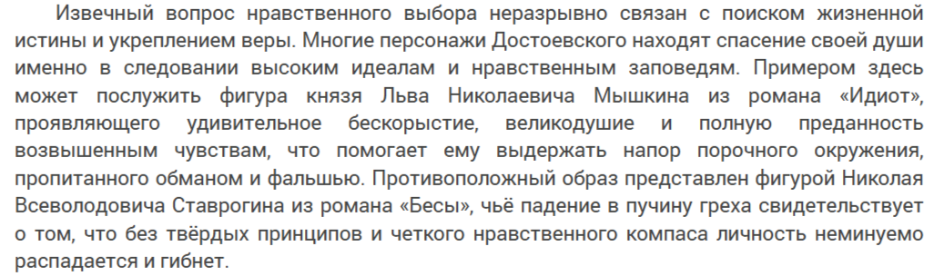В приведенном выше противопоставлении князя Мышкина и Ставрогина, а также в другом примере сравнения Алёши и Ивана Карамазовых мы видим иллюстрацию полярных результатов нравственного выбора — путь к свету и путь к духовной гибели. Чем больше в поступках героев эгоизма, тем дальше они от Бога и тем ближе к саморазрушению. Это можно считать ответом на вопросы из аннотации к эссе: