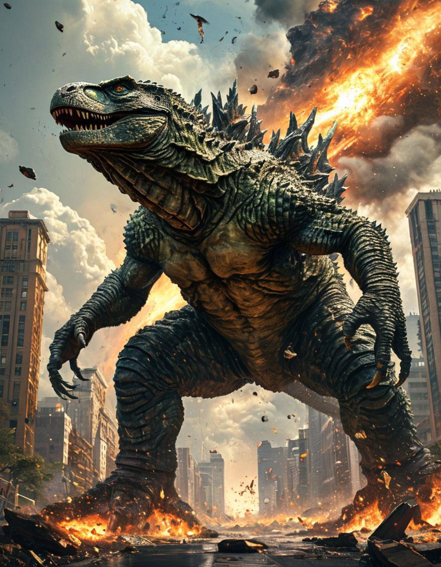 Толчки продолжались, становились все ощутимее, и ее веселое настроение сменилось тревожностью. После каждого такого толчка по поверхности остывшего чая в чашке расходились круги. Она медленно встала и подошла к окну. Плотные жалюзи закрывали огромное окно во всю стену. Подошедшая девушка отдернула их, и ее взору открылась чудовищная картина, в прямом смысле этого слова. По улице шел огромный монстр! Какая-то помесь динозавра и ящерки, плюющейся ядом. Стоит заметить, что ящерка эта была размером с дом средних таких размеров, и с точки зрения зоологии ящерка была явным переростком.