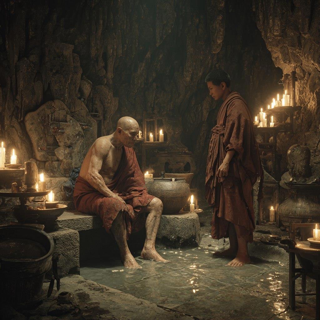 Ника зажмурился от внезапного света. В трепещущем пламени факелов перед ним предстали двое: древний старец, которому, казалось, было не меньше ста лет, и молодой монах лет тридцати. Старик в огненно-красных одеждах грел ноги в естественной каменной лохани, где пузырилась вода горячего источника. Молодой, с полотенцем на плече, почтительно склонился над каким-то свитком.