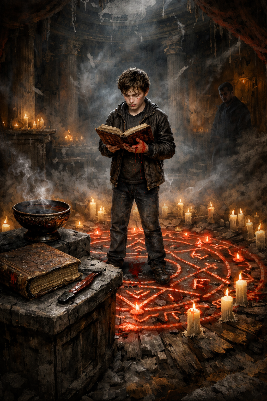 "В центре зала, на обугленных досках, был начертан символ: замысловатый узор из рун, окруженный свечами. Чаша с темной жидкостью и тяжелая книга с потрескавшимся переплетом лежали на постаменте. От них исходил холод, смешанный с глухим гулом, будто внутри этой тишины дышало что-то древнее. Егор встал в круг. Колени подрагивали, но он не отступил.