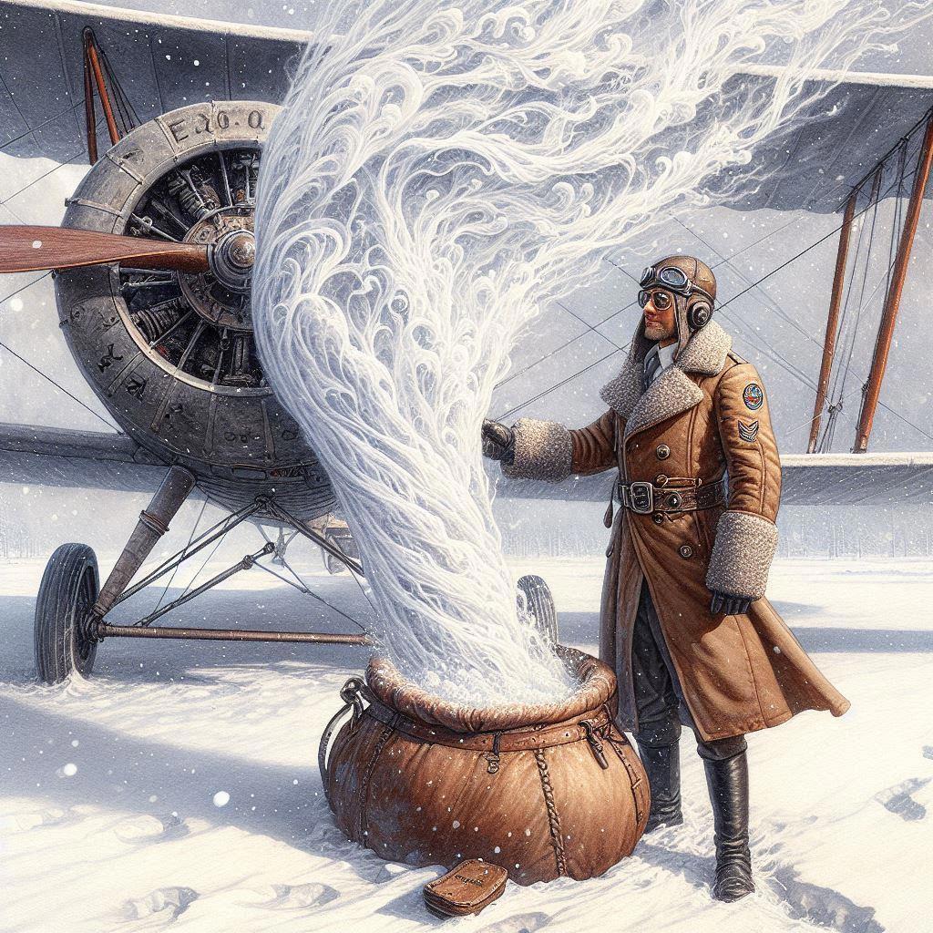Тут все летчики как запросятся... Вышел тогда самый главный начальник — такой кремневый: борода ниже пояса, сам солидный такой. Отобрал себе парня, спрашивает: «Можешь долететь?» — «Могу», говорит летчик. Шлем на глаза надвинул, подвязался и полетел. Русскому человеку холод привычный. Подлетает летчик к тому месту, где земля пловучая, видит справа стеной туман подымается, слева туча надвигается, а посреди ледовая гора выше облаков стоит и на ней крепость снежная, а в той крепости ветры заключены. «Ты меня спусти по канату на землю, а я уж с ними сам справлюсь», — говорит начальник.