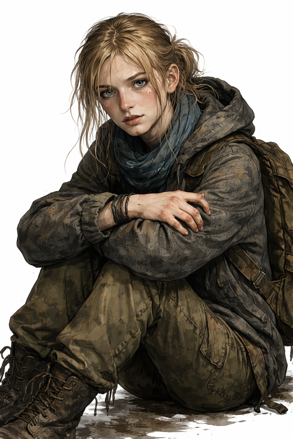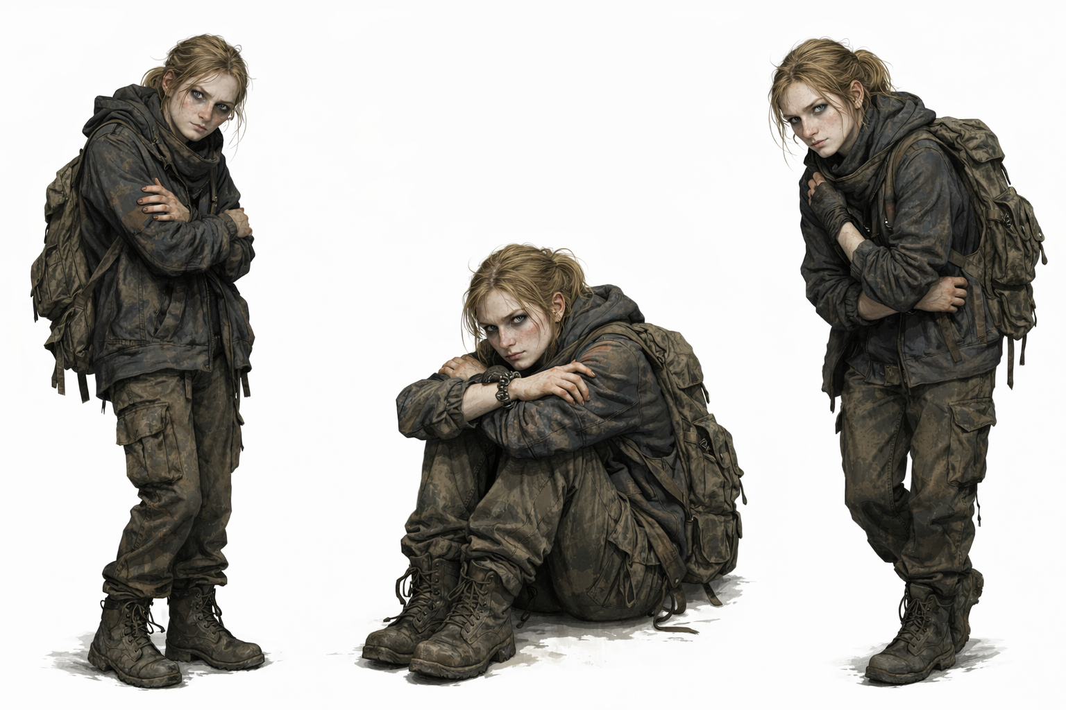 Внешность (базовая): Худая до прозрачности («кожа да кости»), что типично для мира выживания. Светло-русые волосы, собранные в небрежный, давно не мытый хвост. Серо-голубые глаза. Черты лица выразительные, но заострённые недоеданием и усталостью.