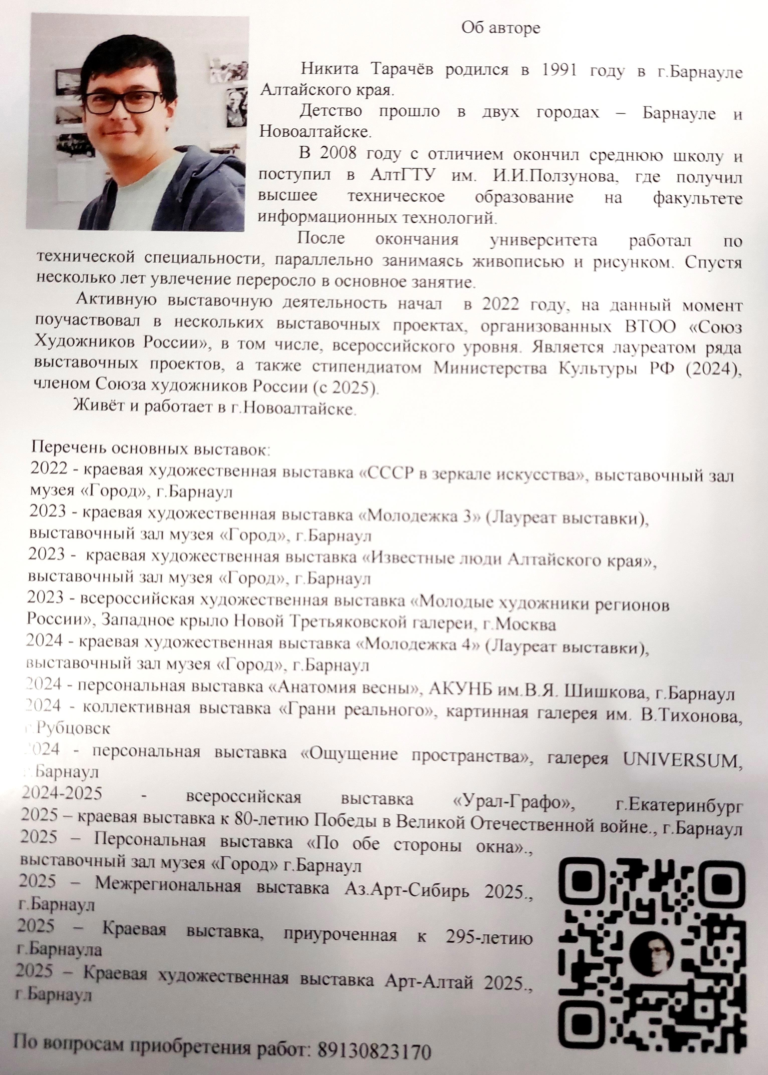 С декабря 2025 года в Мемориальной Библиотеке им. В.М. Башунова (Барнаул, Алтайский край) работала персональная выставка молодого художника-живописца, члена Союза художников России - Никиты Тарачёва.