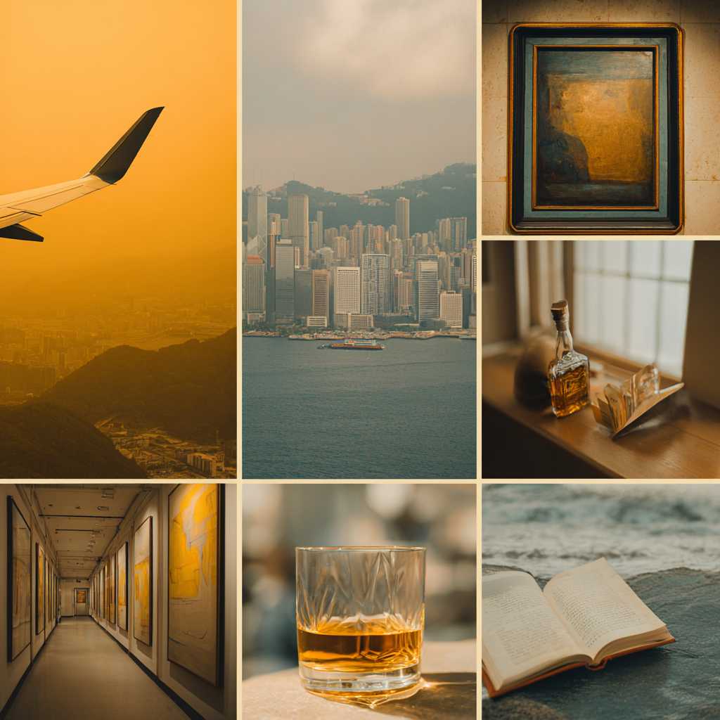 Сделай Эстетичный коллаж, состоящий из семи отдельных квадратных кадров одинакового размера: 1 - [встреча с поклонниками]; 2 - [ крыло самолёта, вид из иллюминатора на Гонконг]; 3 - [музей современного искусства - зал с картинами]; 4 - [улица в Гонконге]; 5 - [книга у окна с видом на пляж в солнечный день]; 6 - [дорогой виски - бутылка и стакан]; 7 - [свобода]. Внешность людей европейская. Стиль: в стиле журнала, мягкий контраст. Добавь разные предметы по теме как во время Скрапбукинга.