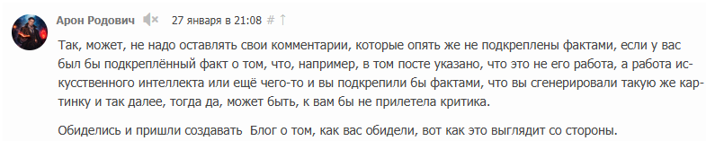 При этом я ни разу не оскорбил ни викинга, ни Наталью Грейш, ни кого-либо в этих двух темах. Меня назвали быдлом только на основании одной фразы: "Не хочу расстраивать, но это не он сделал. Это AI-генерация с наложением текста поверх изображения. Зачем приписывать кому-то заслугу, если подобное не составляет труда?" Я не писал что картинка плохая. Я не оскорблял кого-либо. Но эта кодла вполне позволяет себе делать такое в отношении меня. Я взрослый зрелый человек и понимаю, что меня хотели спровоцировать. Простите, не вышло. Вы показали только свою интеллектуальную импотенцию, скатившись в оскорбления.