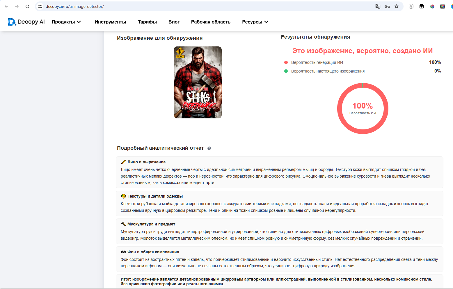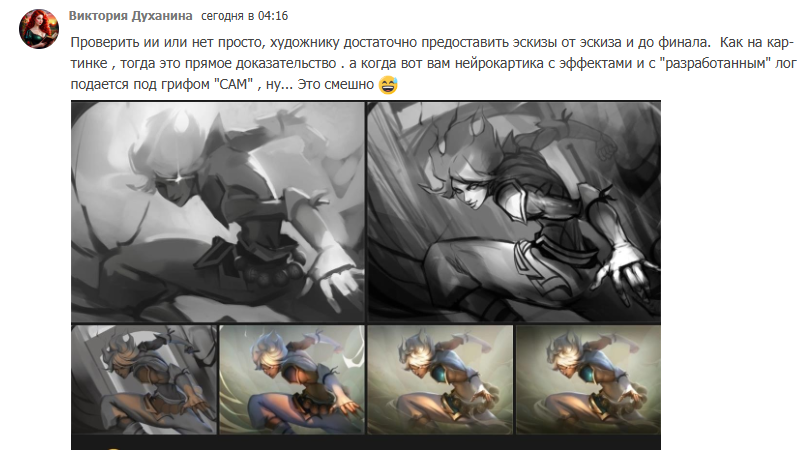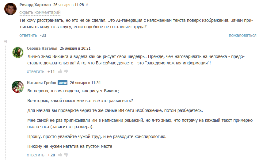 Под моим комментарием, из-за которого всё началось, Наталья Грейш написала: "Для начала вы проверьте через те же самые ИИ сети изображение, потом разберётесь"
