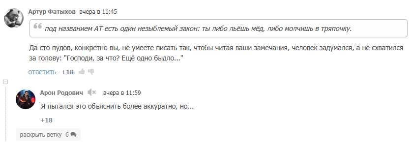 Прошу заметить, в той теме я больше ничего не писал. Не пытался спорить. Не пытался отстаивать свою позицию, стоять на своём. Не было задачи разводить конфликт из-за несовпадения взглядов. Такое случается каждый день, здесь, на работе, на улице и в общественном транспорте. Со мной не согласились? Да и Бог с ними. Поставили минусы на пост? Не страшно.