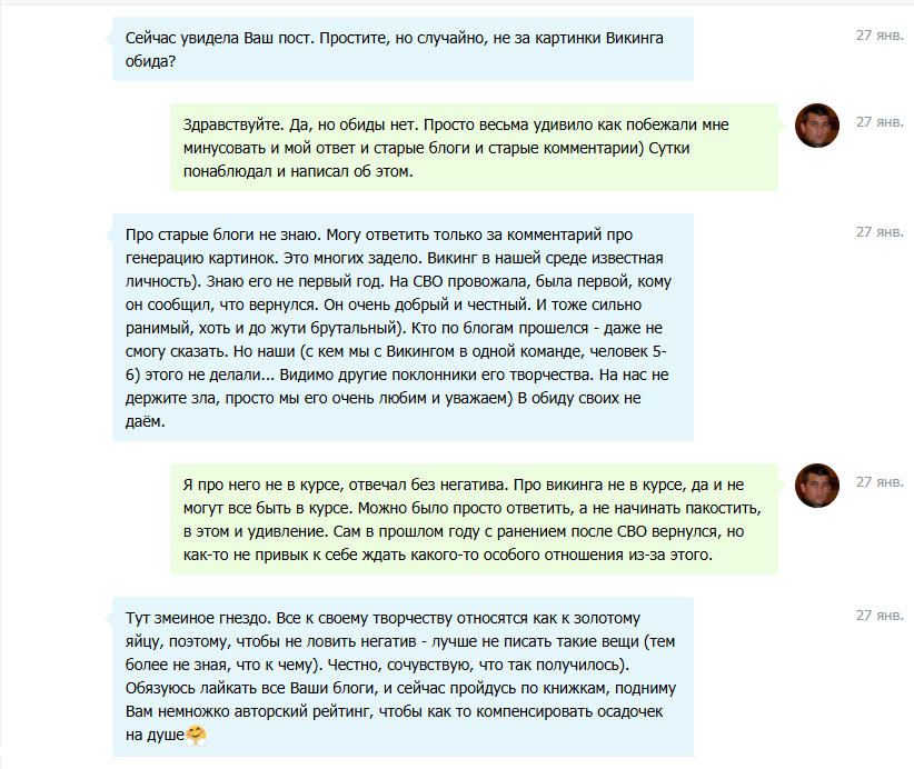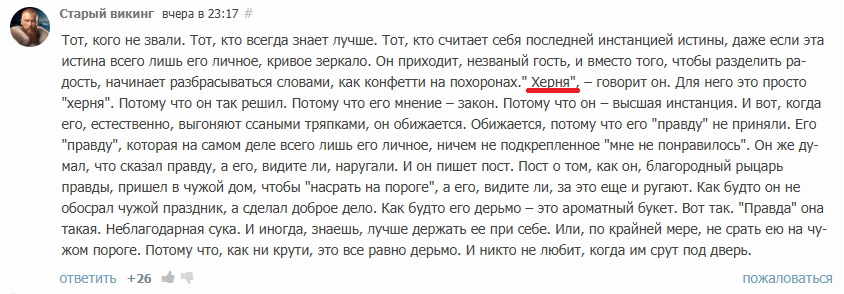 На самом деле, на тот момент и до вчерашнего вечера к викингу у меня вообще не было никаких претензий или неприязни. Во-первых, потому что он лично ничего не писал ни мне, ни в этих двух темах, о которых сказано выше. Додумывать плохое конкретно про него что он в числе тех кто минусит все мои комментарии и посты я не хотел. Тем более мне в личные сообщения написали следующе:Казалось бы, всё должно было закончиться. Оскорбляторы полаяли в моей теме, оставшись при своём мнении. Но нет же, у народа продолжает свербить в одном месте. Вчера создали ещё одну тему - Нытьё о нытье. И всё бы ничего, но туда прибежал викинг и начал уже оскорблять меня. В то время как, я напоминаю, я про него ни слова плохого не говорил. Вот он, ваш герой)