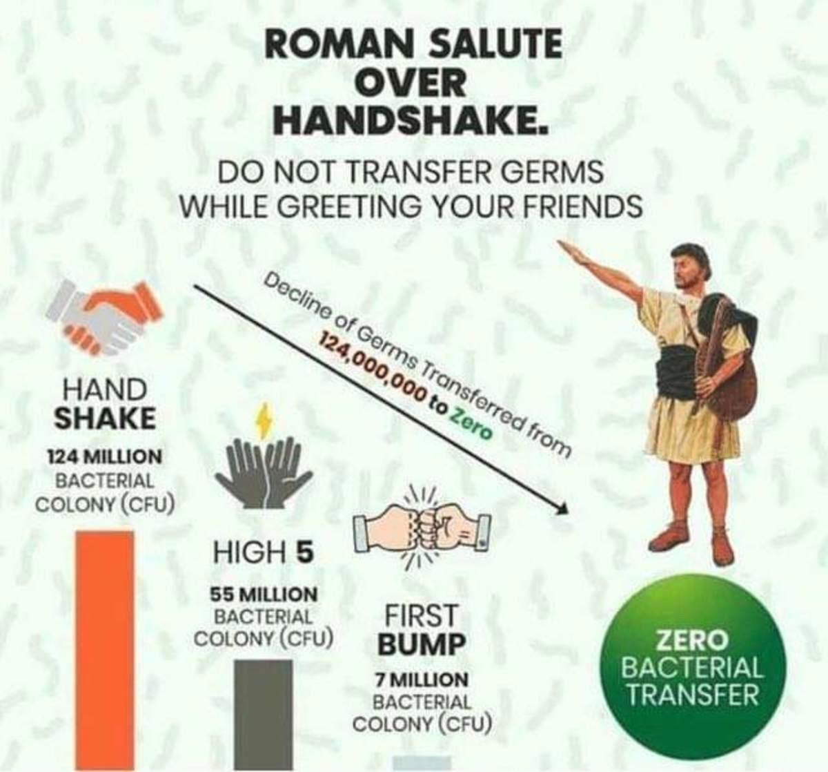 Автор: Branwena LlyrskaЗначит так, народ. В Сети активно кочует эта картинка, призывая использовать так называемый «римский салют» вместо традиционных рукопожатий, приветствий «кулачки», «дай пять» и так далее, дабы не распространять вирусы.
