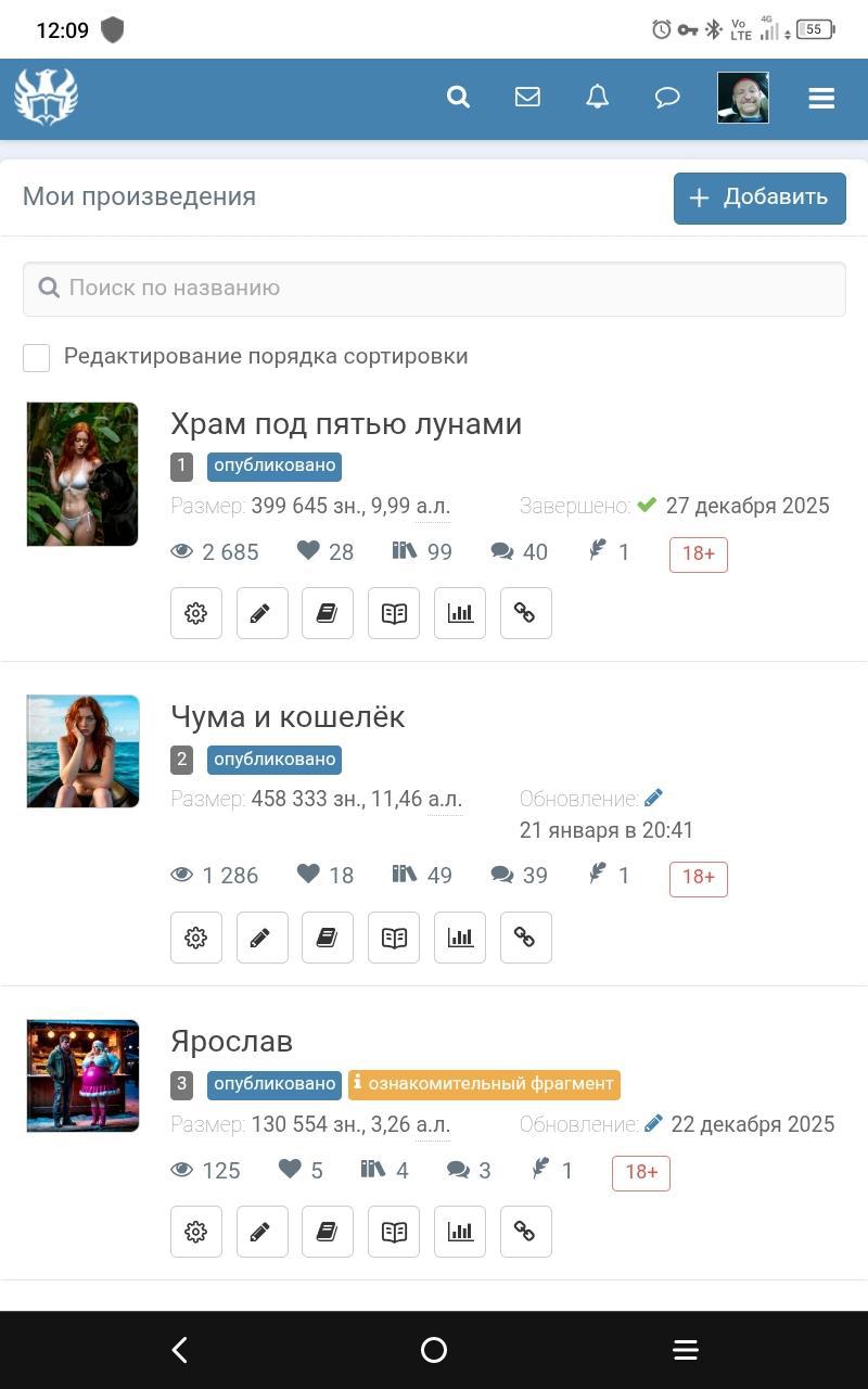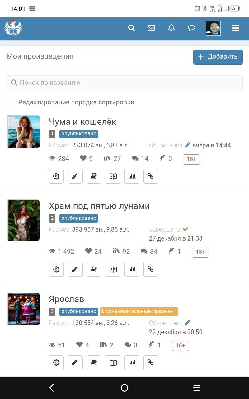 А при 2 685 просмотрах 28 лайков и 99 библиотек. , (Храм под пятью лунами) но эти 99 библиотек висят постоянно, бывает что число уменьшается , но буквально на следующий день выравнивается. На второе произведение стабильно висит цифра 49 библиотек. При этом иногда ресурс рекомендует "популярным" и "горячей новинкой" откровенную лажу или даже плагиат. ( Например "Его звали Тонни"). В общем у меня складывается устойчивое впечатление что тут какая то Лажа.