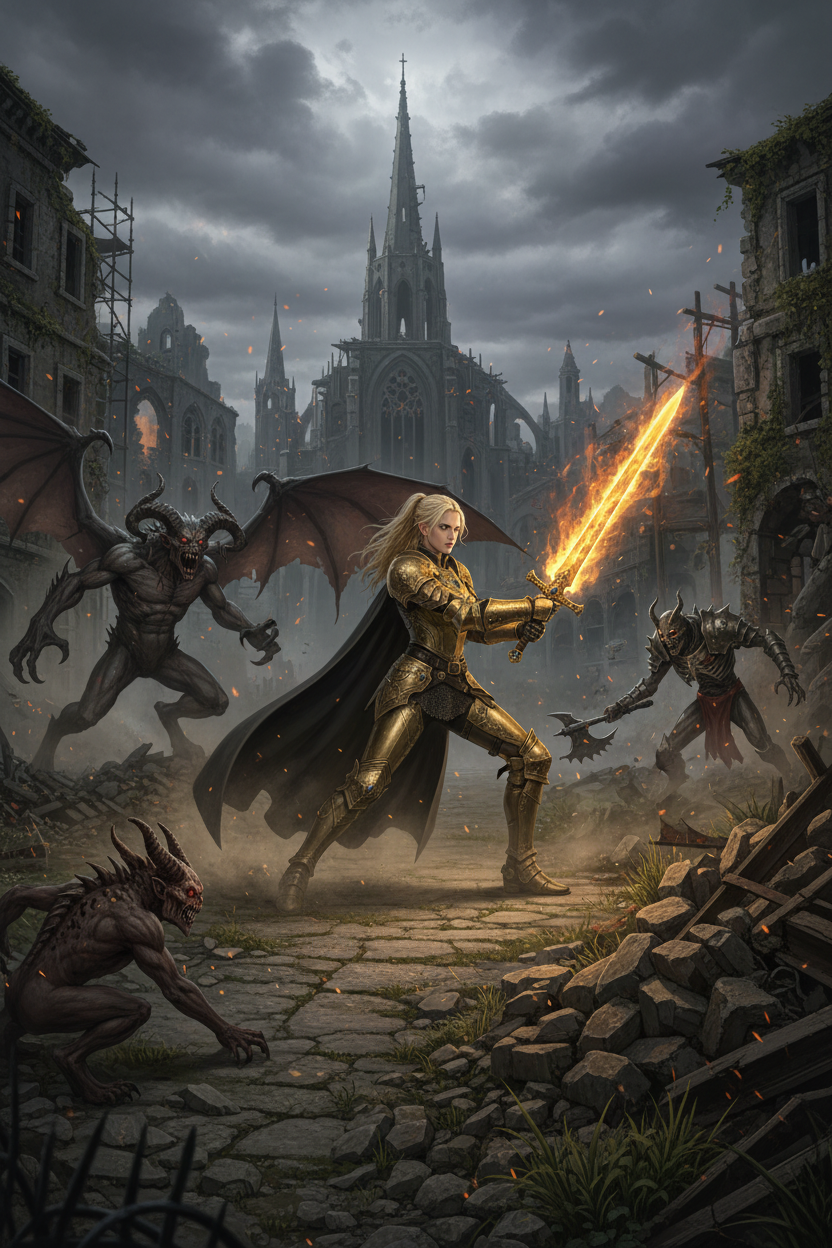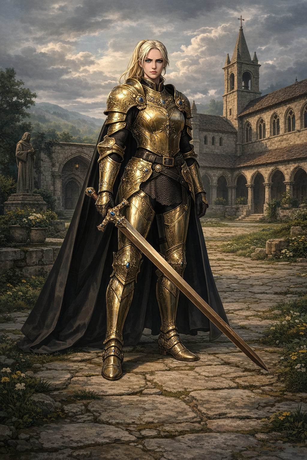 Автор: Руслан БирюшевОтличнейший портрет от ИИ, показывающий сестру-командора Ангелу, Живую Святую - то есть церковную охотницу на демонов и их аналоги. Она действует в Дертской дилогии, но является отсылкой на героиню комиксов моего друга из Канады, Войцеха Савицкого (DoodlePoodle), паладина Ангелу Хоторн :)