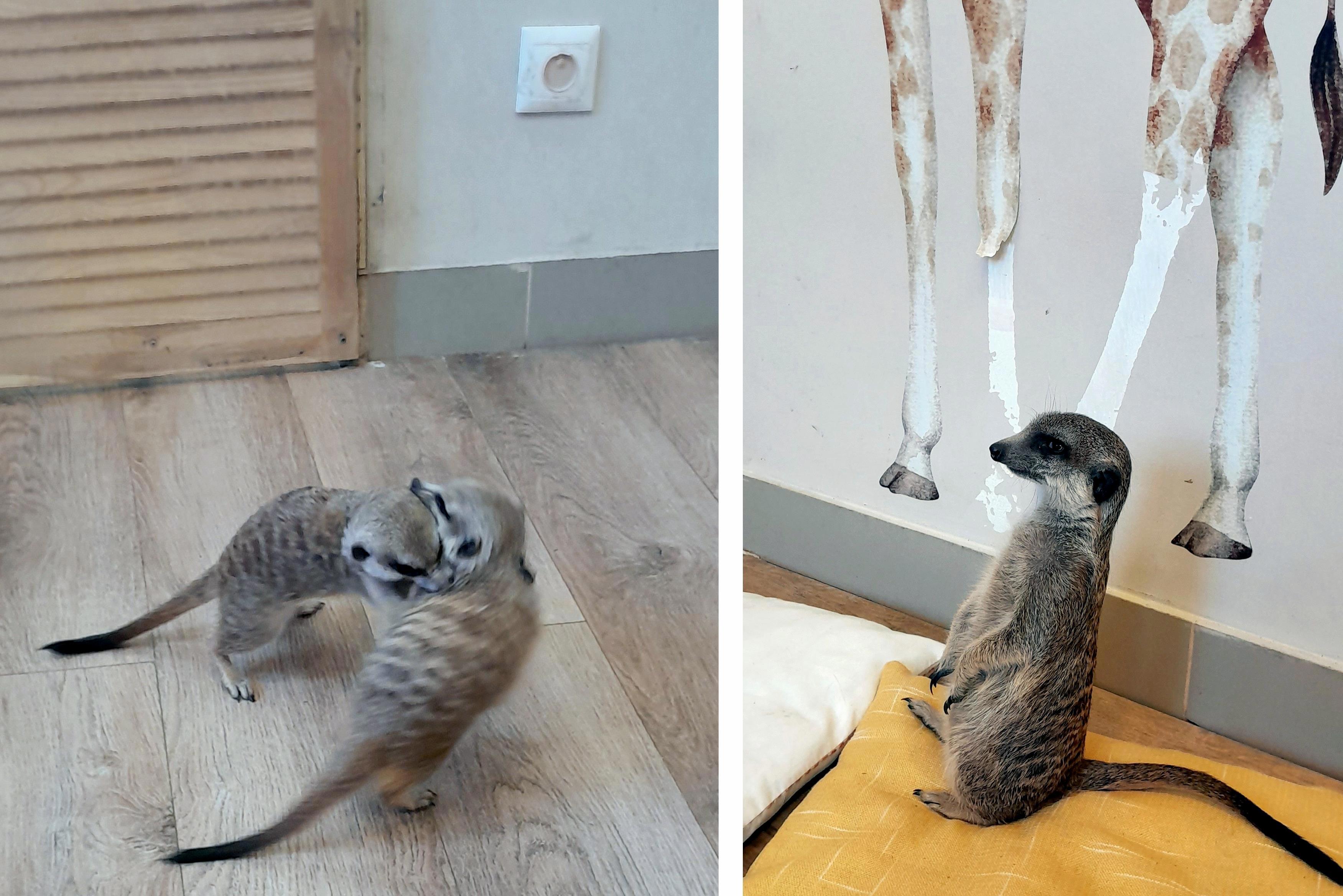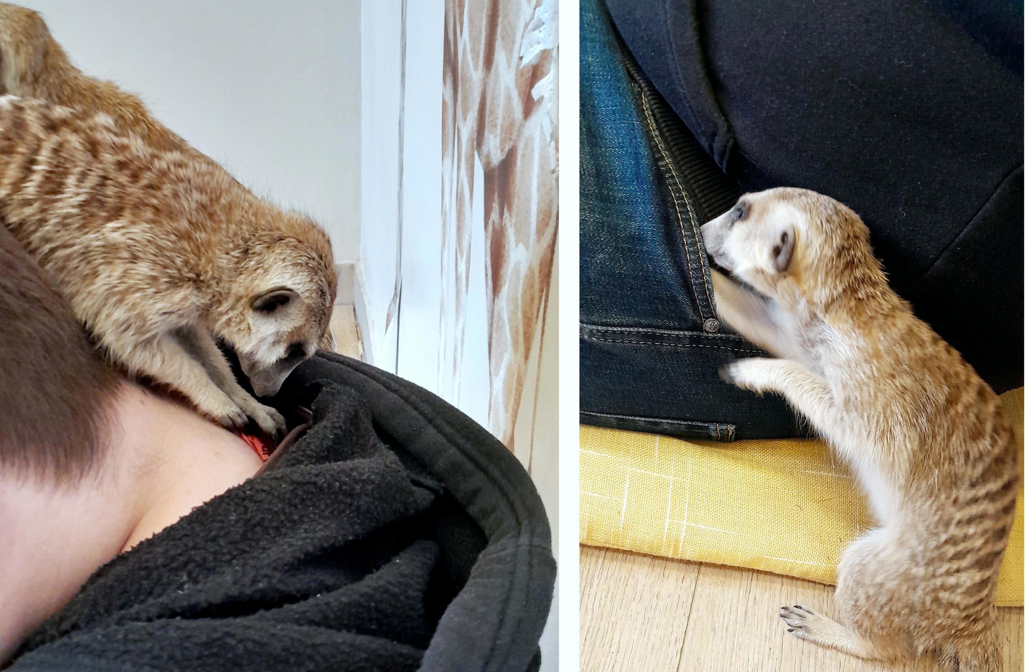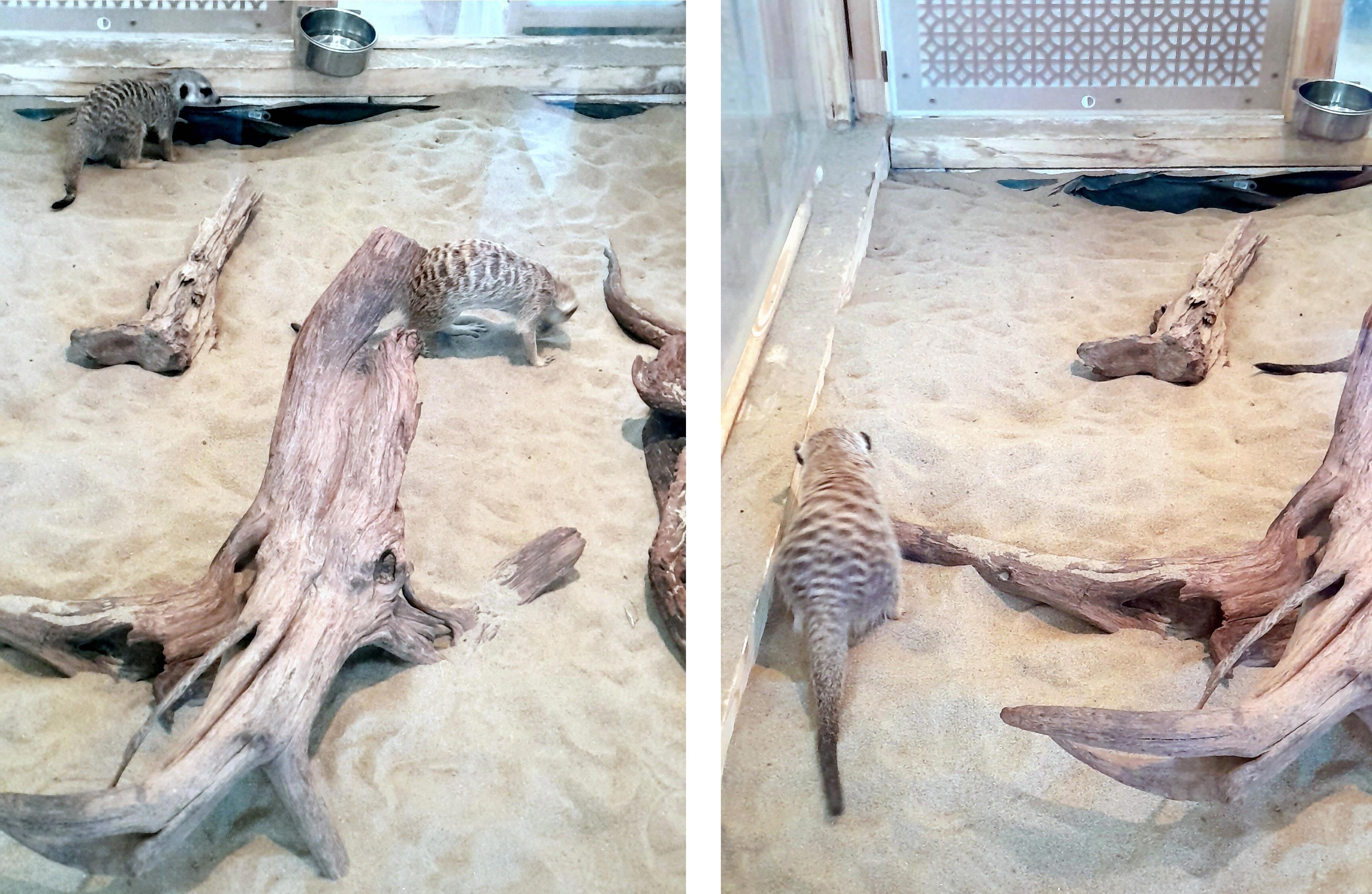 Сурикаты оказались меньше, чем я предполагала, размером примерно с котенка-подростка. Они очень любопытные, общительные, доверчивые и очень шустрые! Мне пришлось удалить много испорченных фотографий, потому что на них зверьки были просто размыты, так быстро они носились по комнате.