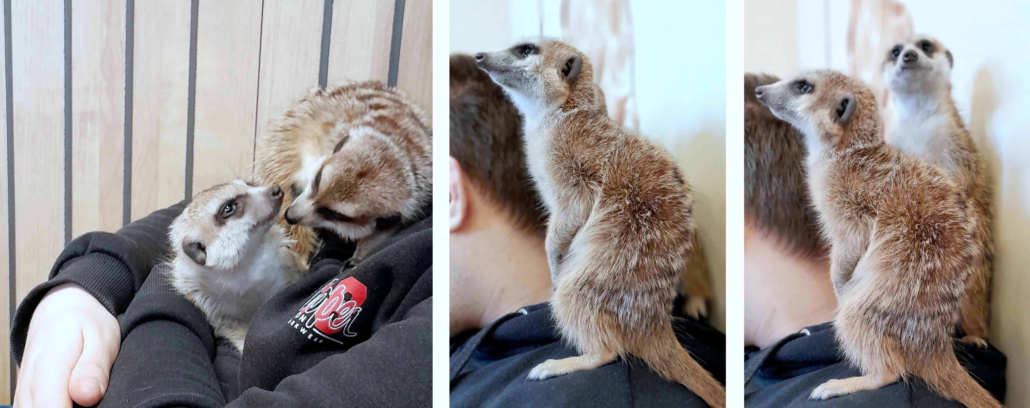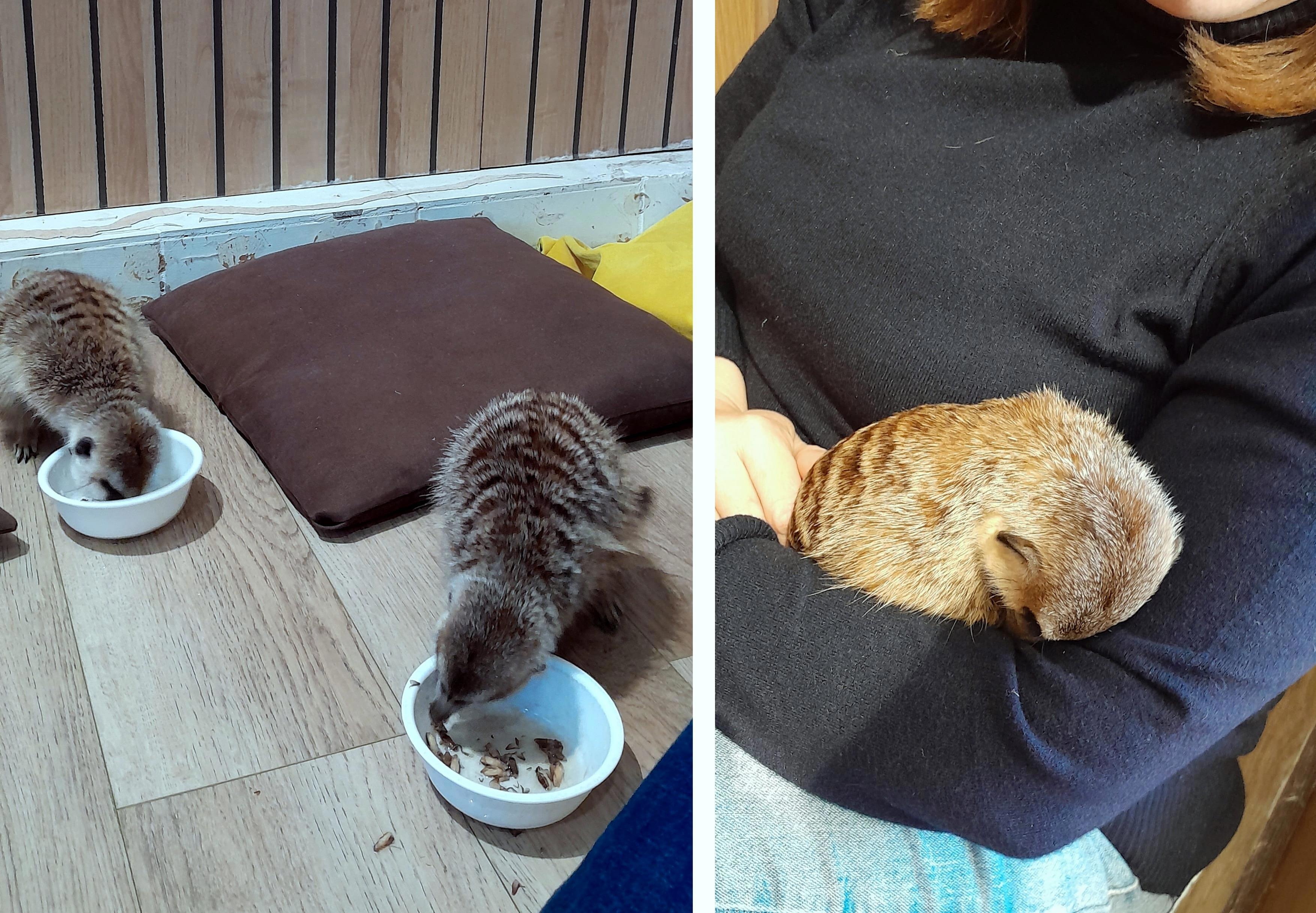 Сурикаты постоянно тихонько верещат, звук представляет что-то среднее между кошачьим мурлыканьем и птичьим чириканьем. Шёрстка у них жестковата, но приятна на ощупь. Они пугливы, поэтому мы даже говорили между собой тихо. Наблюдать за ними было очень весело! Они бегают по тебе, быстро-быстро скребут по твоим пяткам и спине коготками, играют друг с дружкой – это нужно видеть!