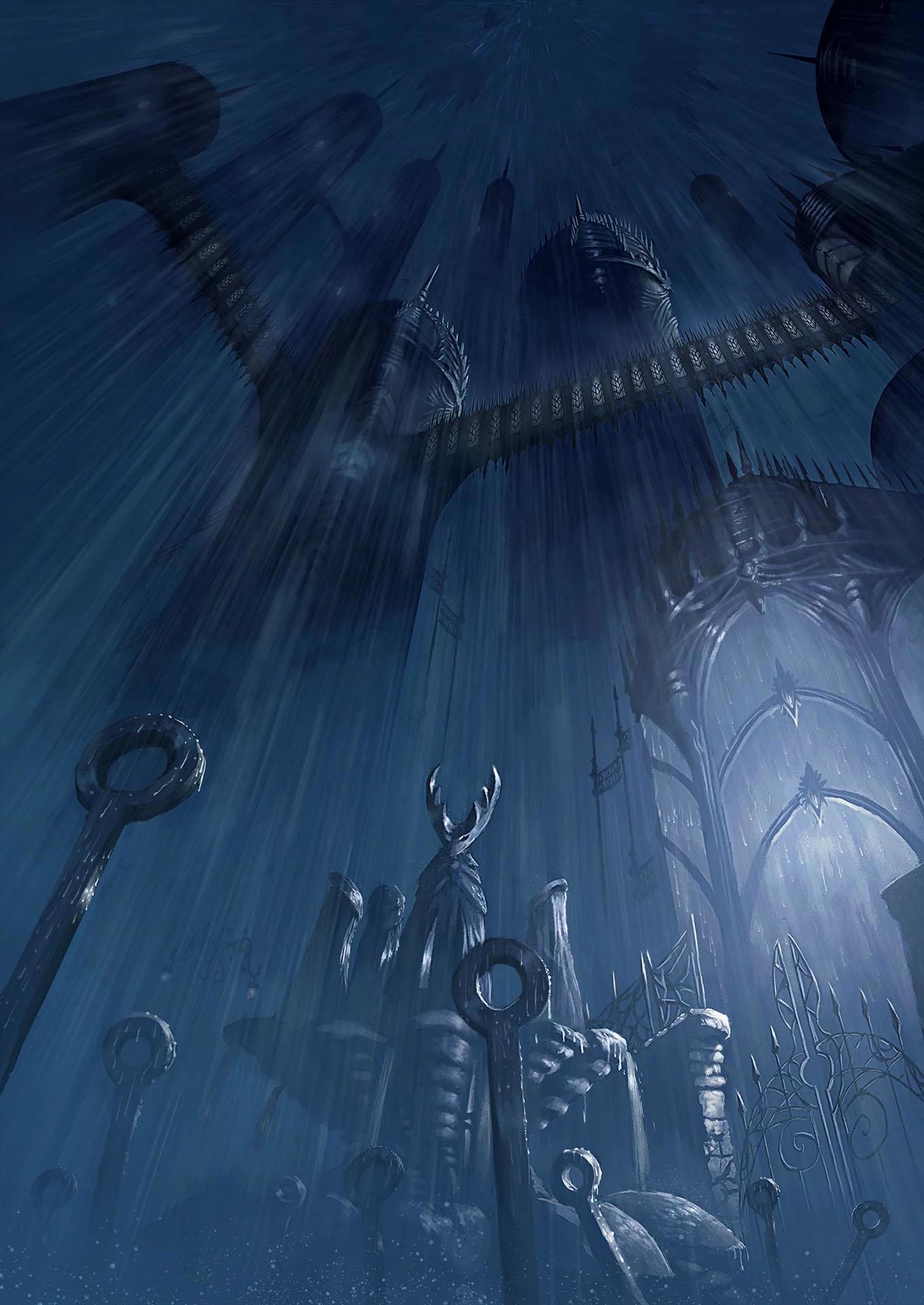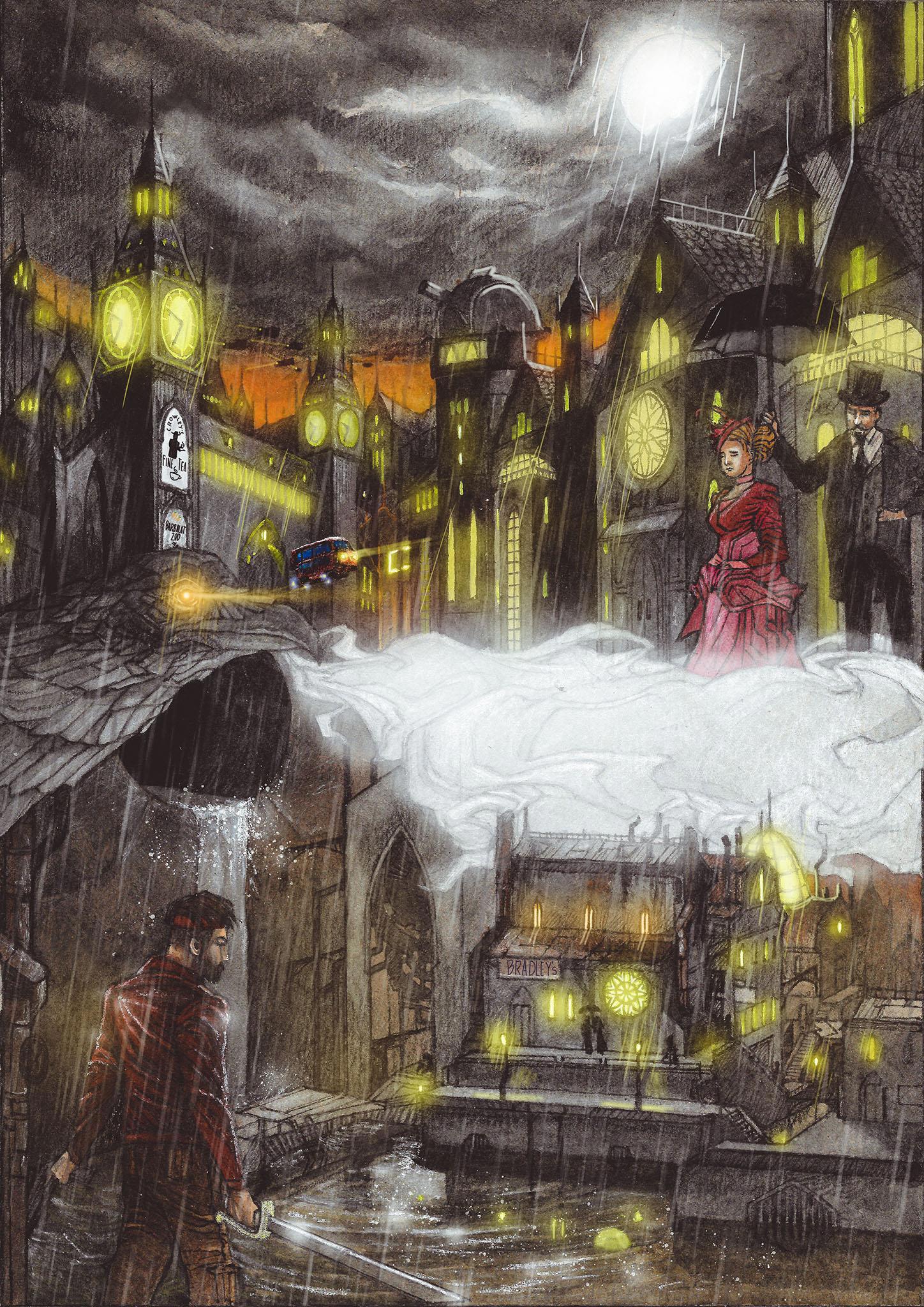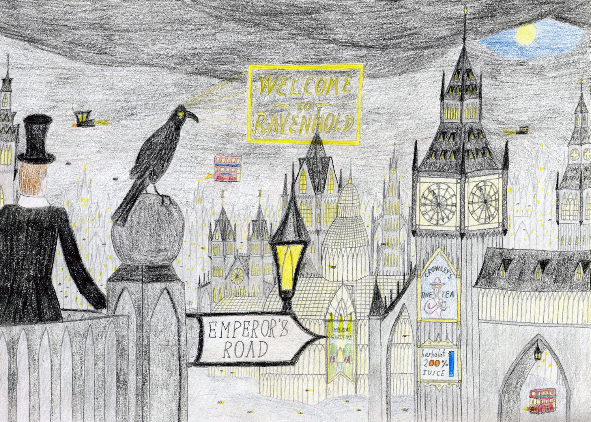 Планета Рейвенхольд, иллюстрация автора. Здесь видно башню Литтл-Джон, Имперские сады и Собор святого Бенедикта. И красные автобусы.