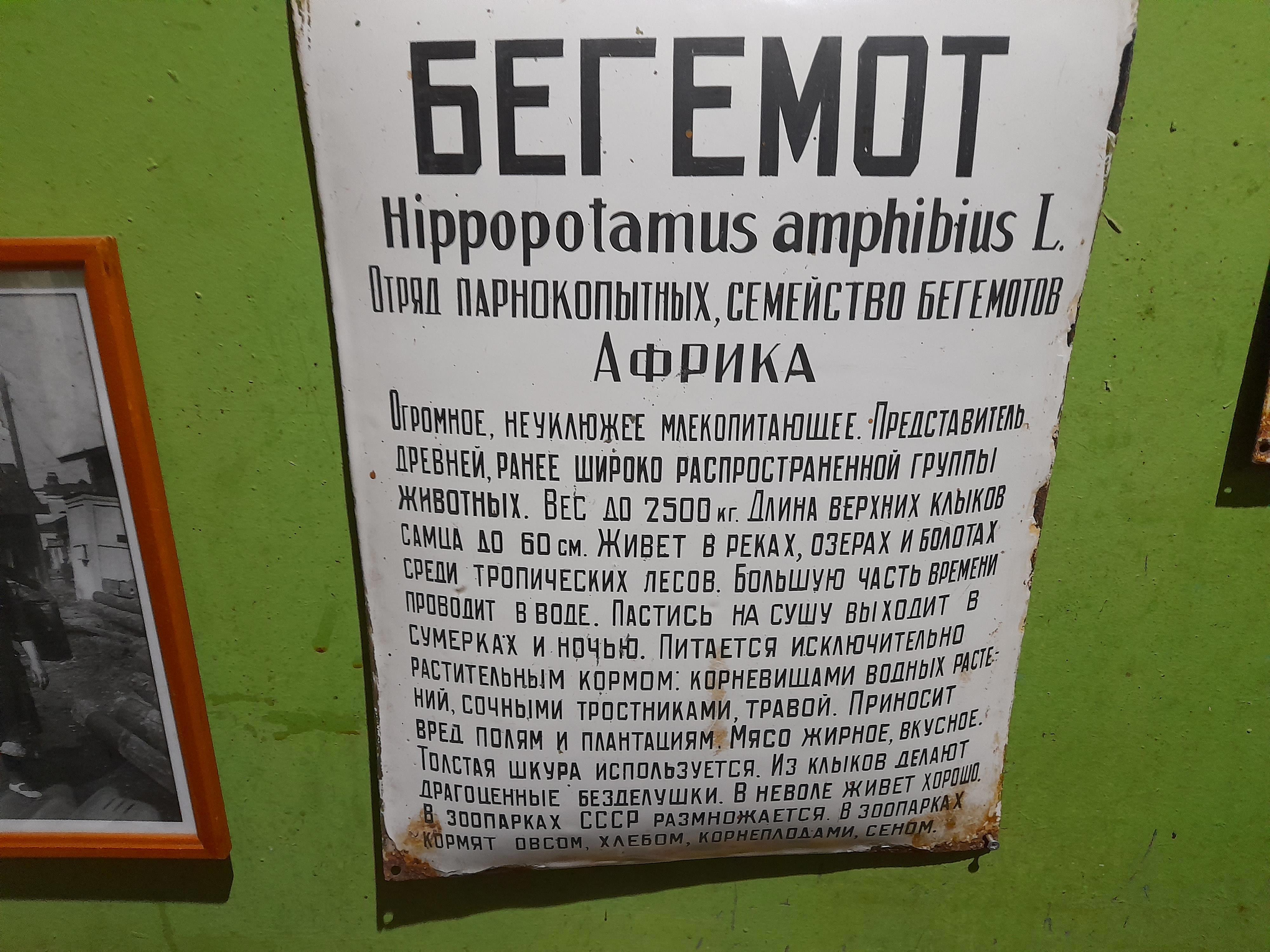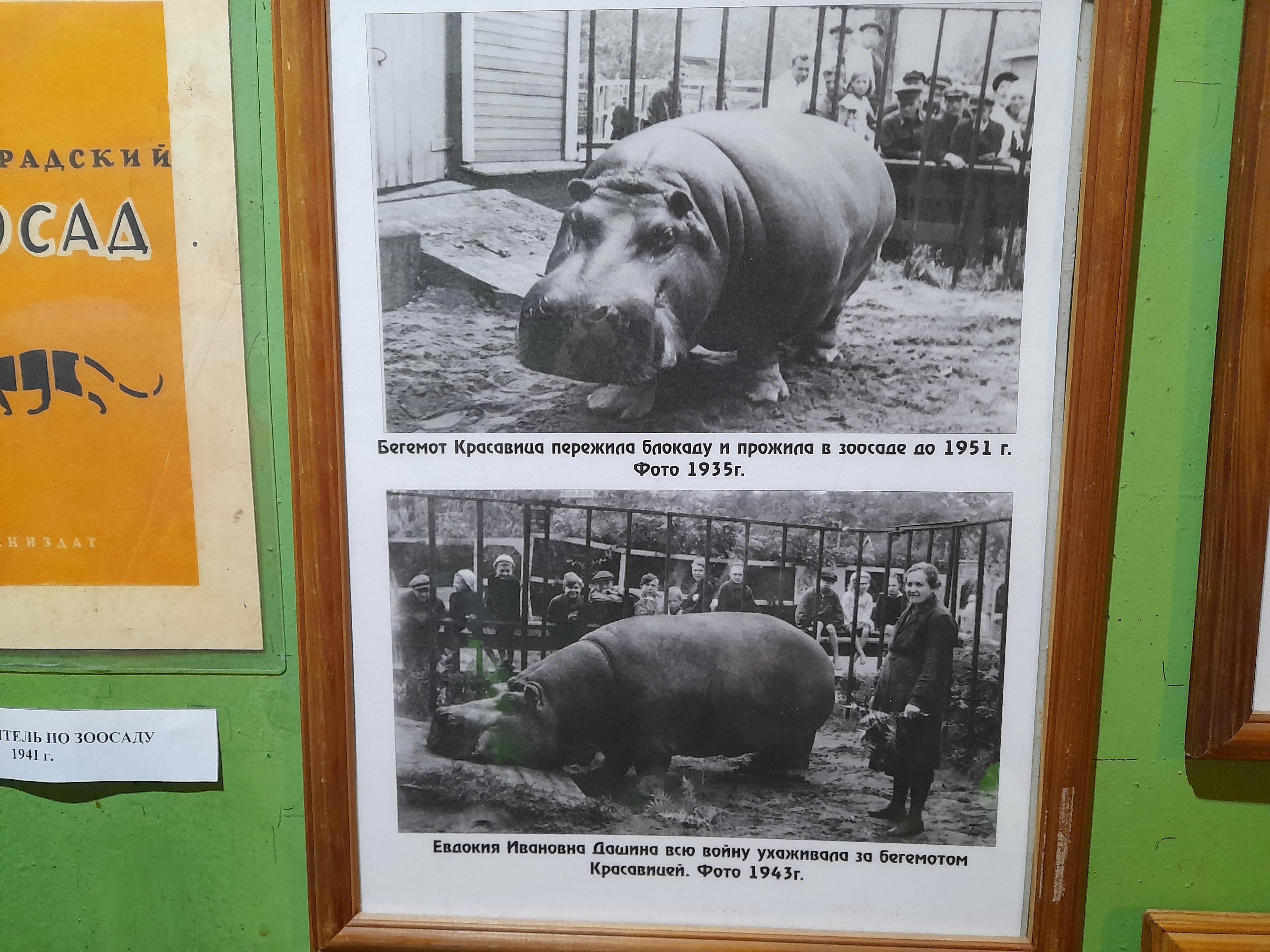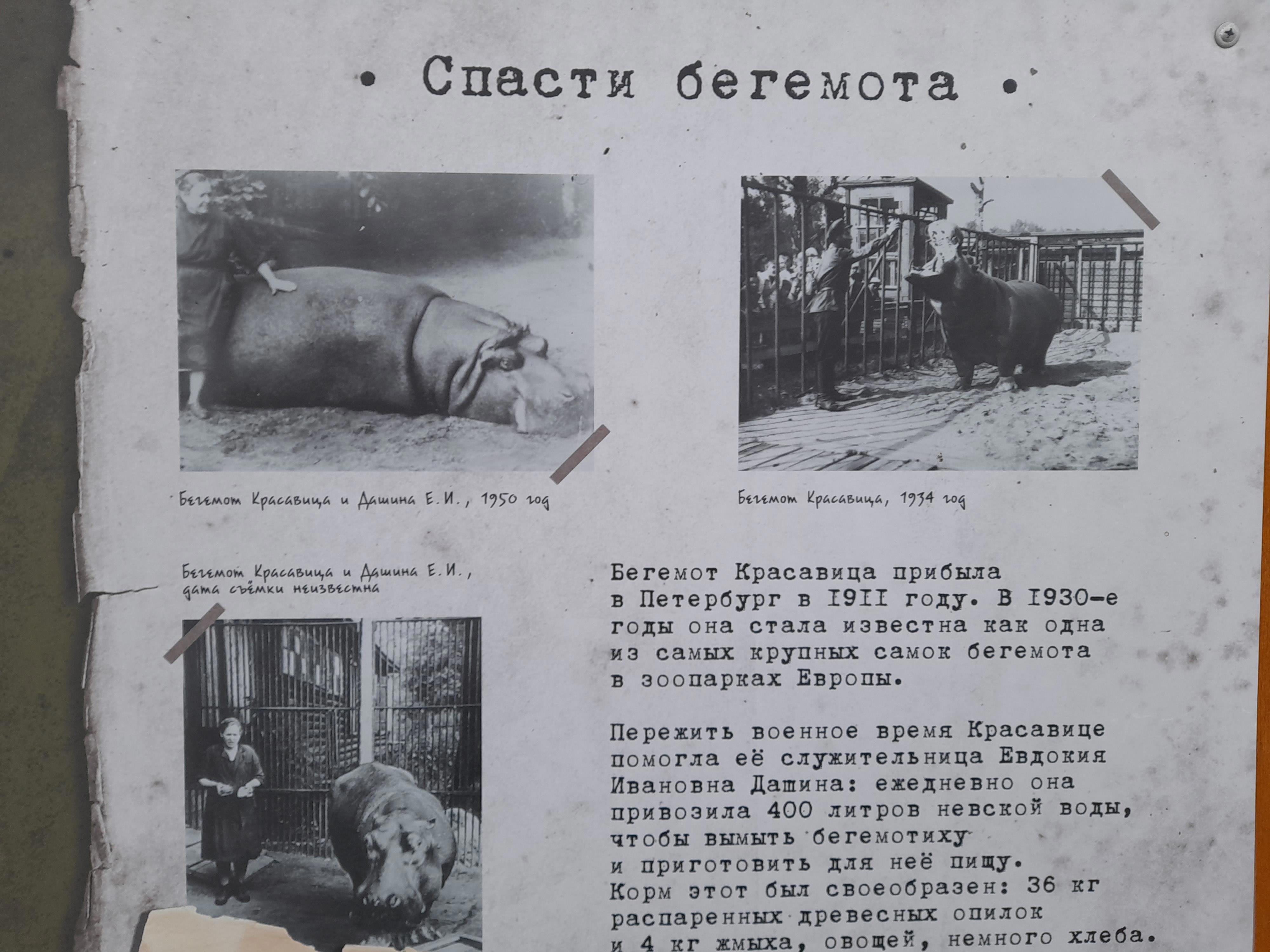 Из оформления в зоопарке. Опять же не знал, что с момента прибытия гиппопотамки в Санкт-Петербург за ней ухаживал отец Дашиной, а когда состарился - передал зверя дочке. Видимо это сработало, когда Дашина в ходе бомбежек успокаивала перепуганную бегемотиху - та ее воспринимала за свою и доверяла полностью.