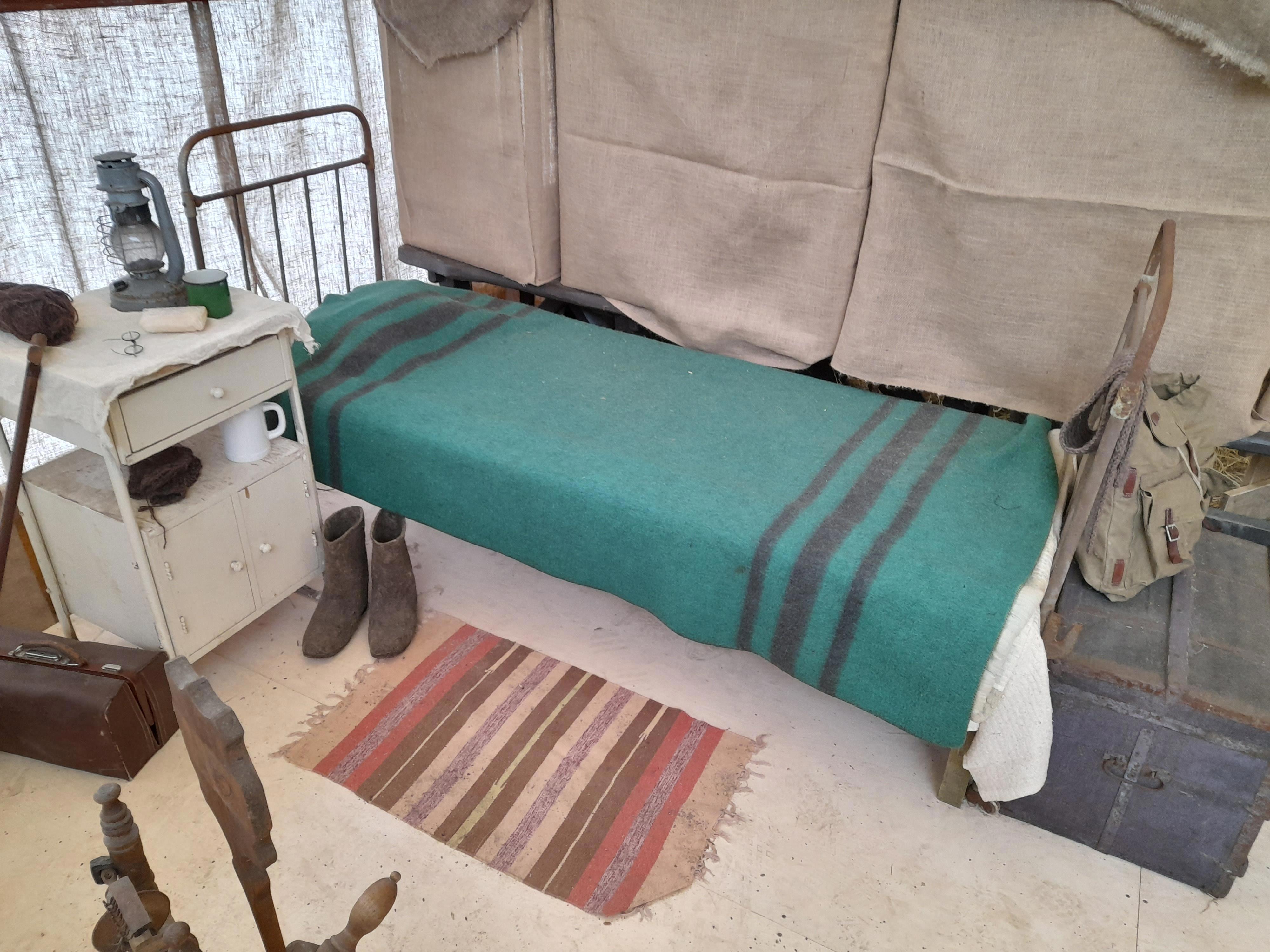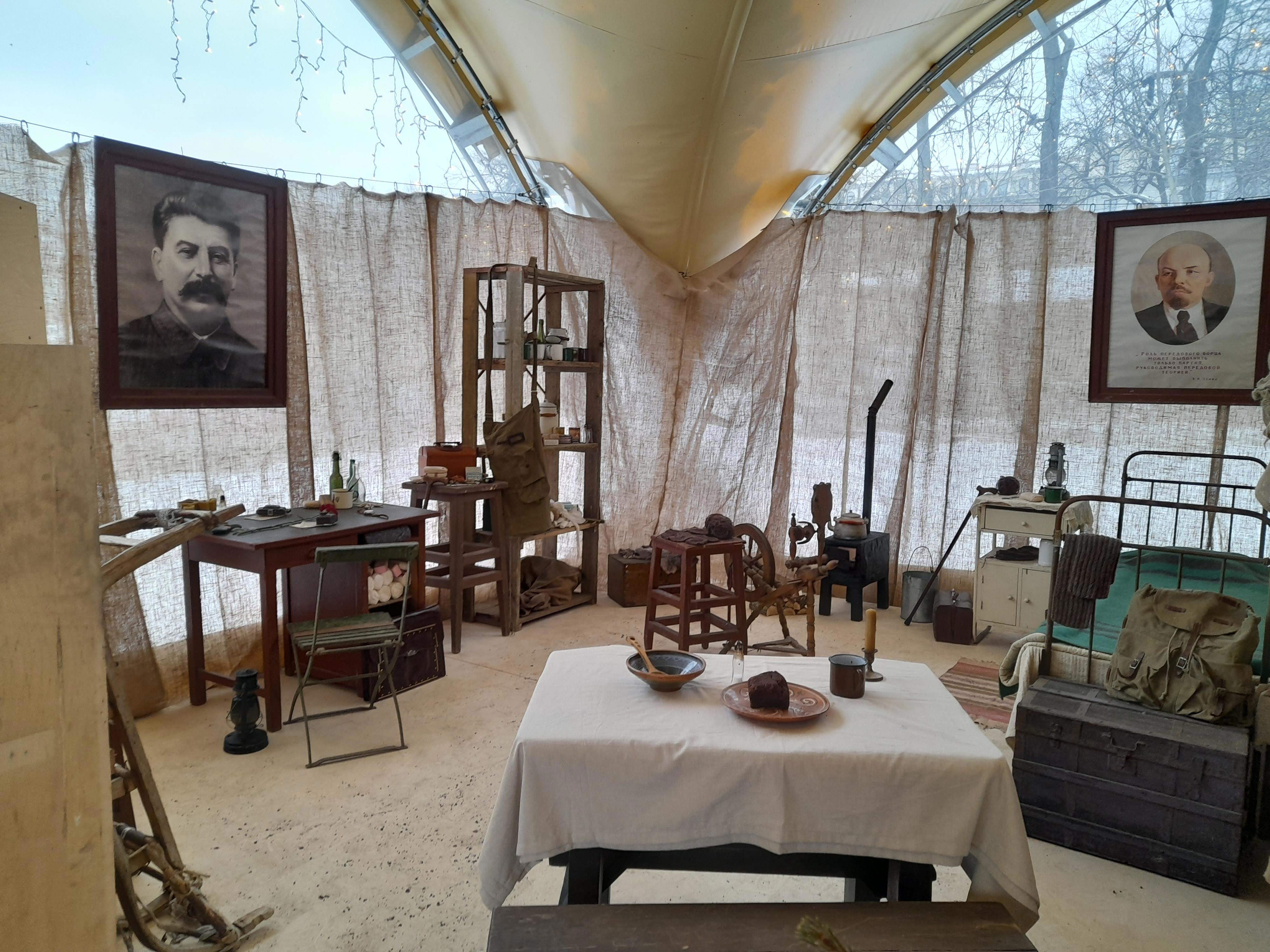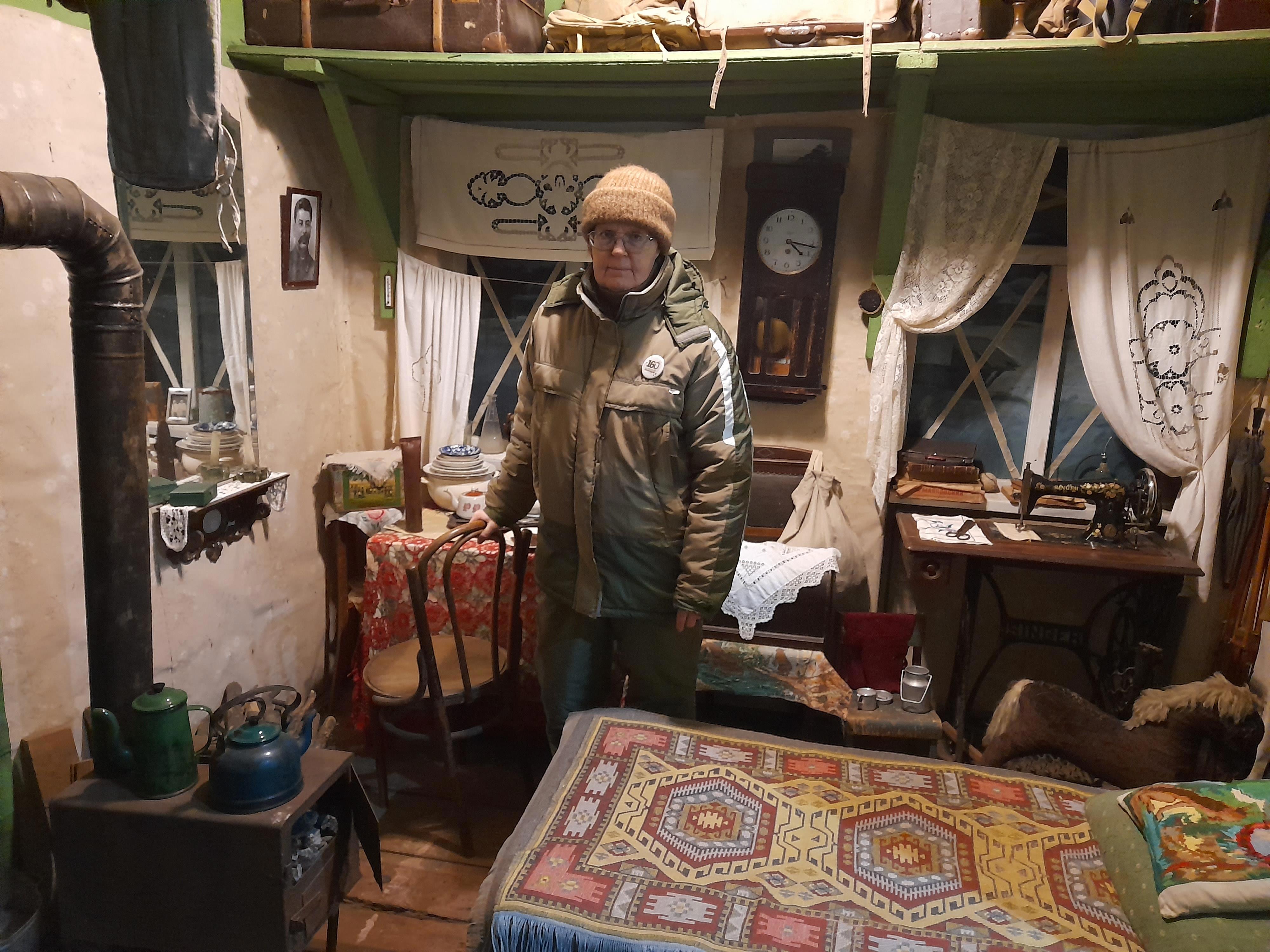 Слева печка-буржуйка с самодельным дымоходом, за ней стол с посудой и лампой-коптилкой. Очень характерны полати - антресоли, примета того времени - потолки высокие, а жилплощадей не хватало.