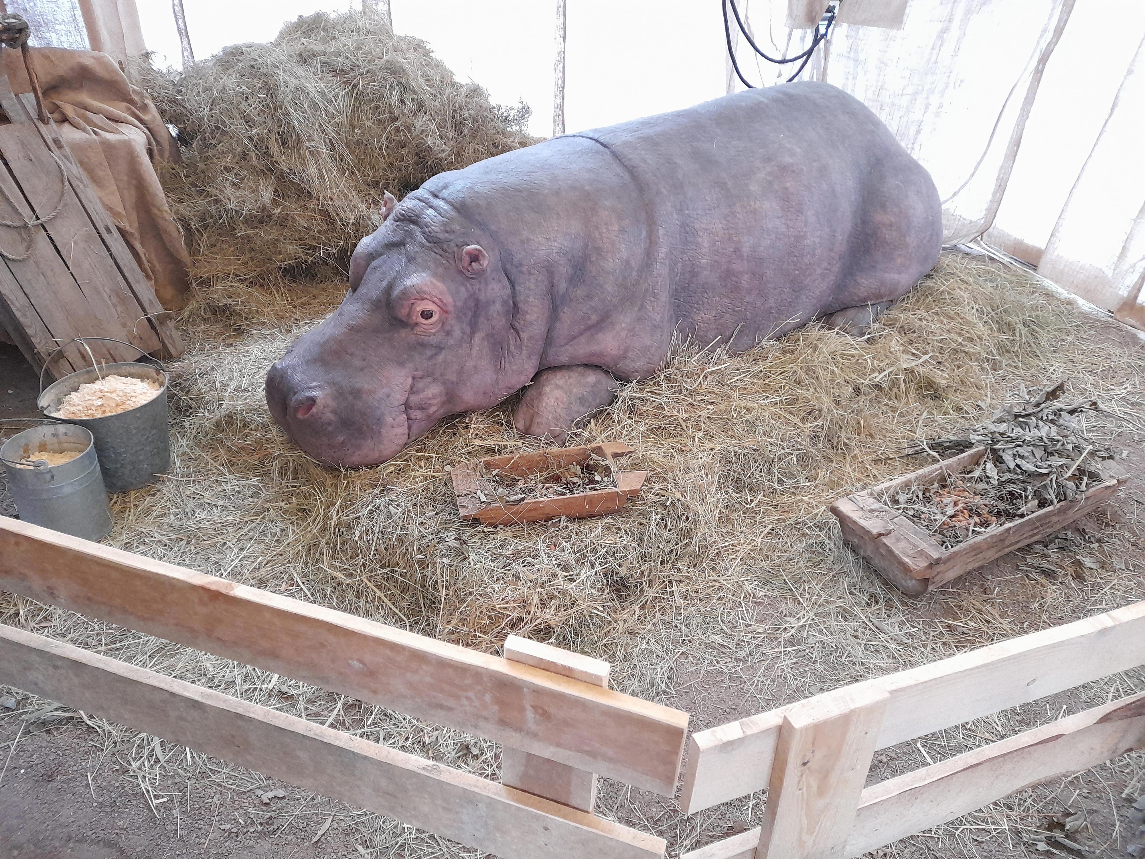А еще ведь и кормить надо гиппопотама. 40 килограммов еды в день вынь и положь. А кормить нечем. Выкручивались как могли - готовя пропаренные опилки и сдабривая их всем, чем можно. Многие знают, что даже кота накормить непросто, а уж гиппопотама...