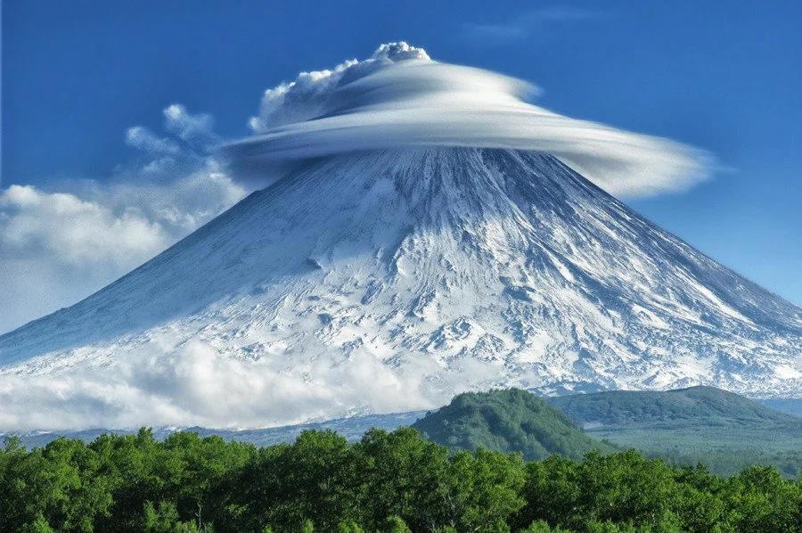 В результате повышенной влажности происходит формирование лентикулярных облаков над Ключевской горой. Имеющие вид конуса широкой формы, лентикулярные облака накрывают вершину сопки словно шляпа. Даже при мощных порывах ветра облака надолго зависают в небе.