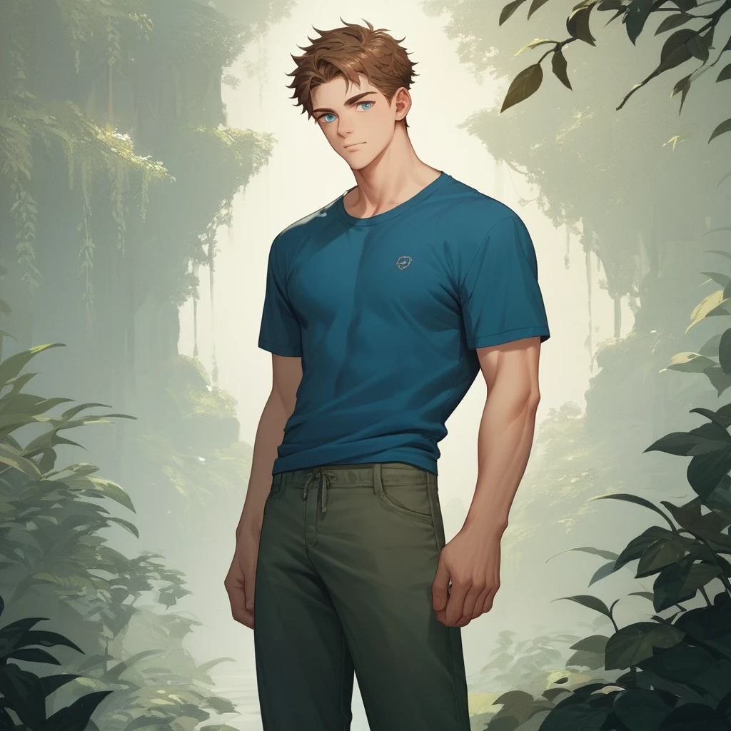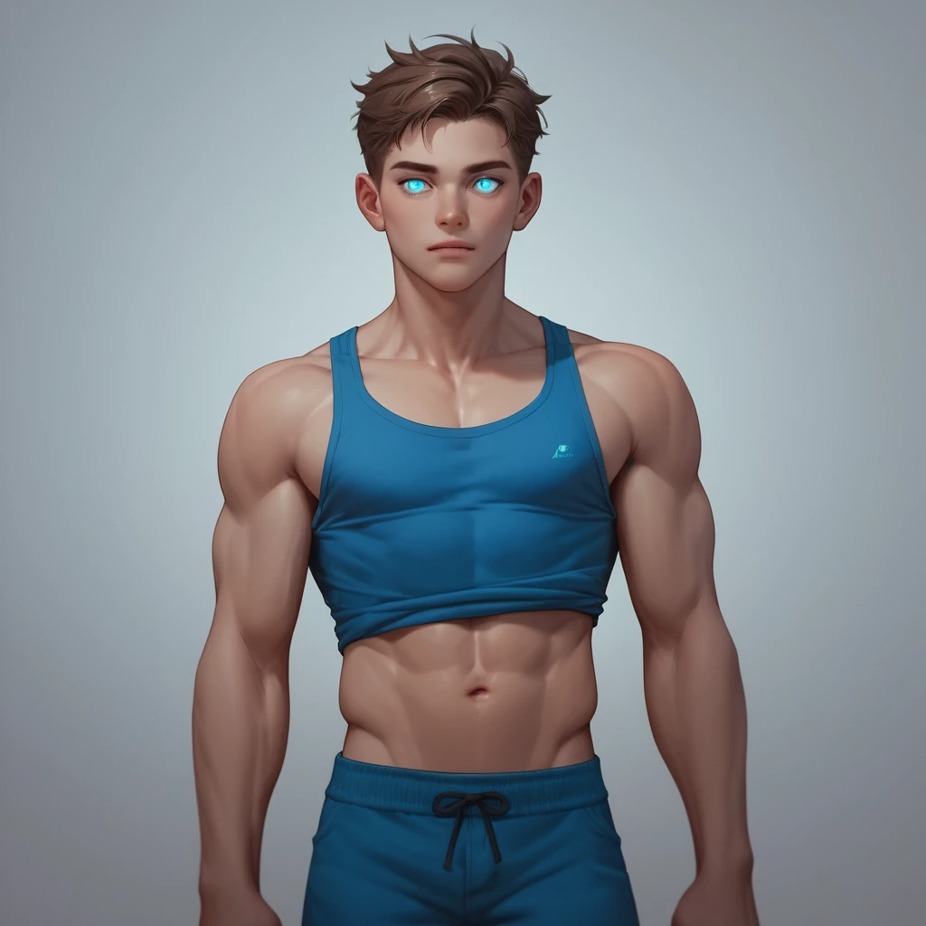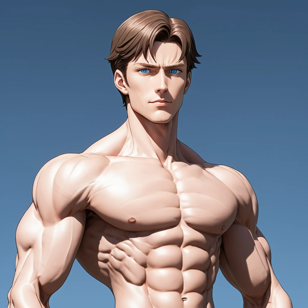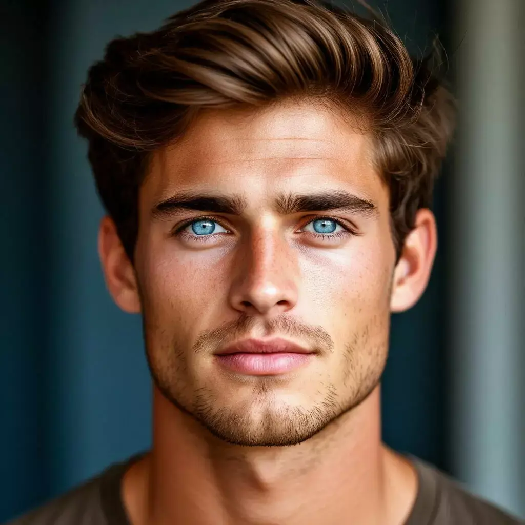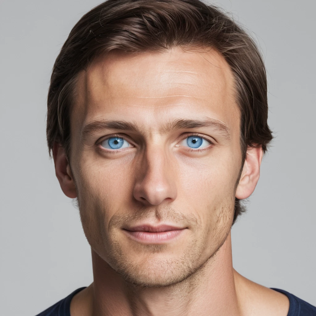 высокий поджарый мускулистый стройный молодой мужчина лет тридцати с каштановыми короткими волосами и прозрачными синими глазами