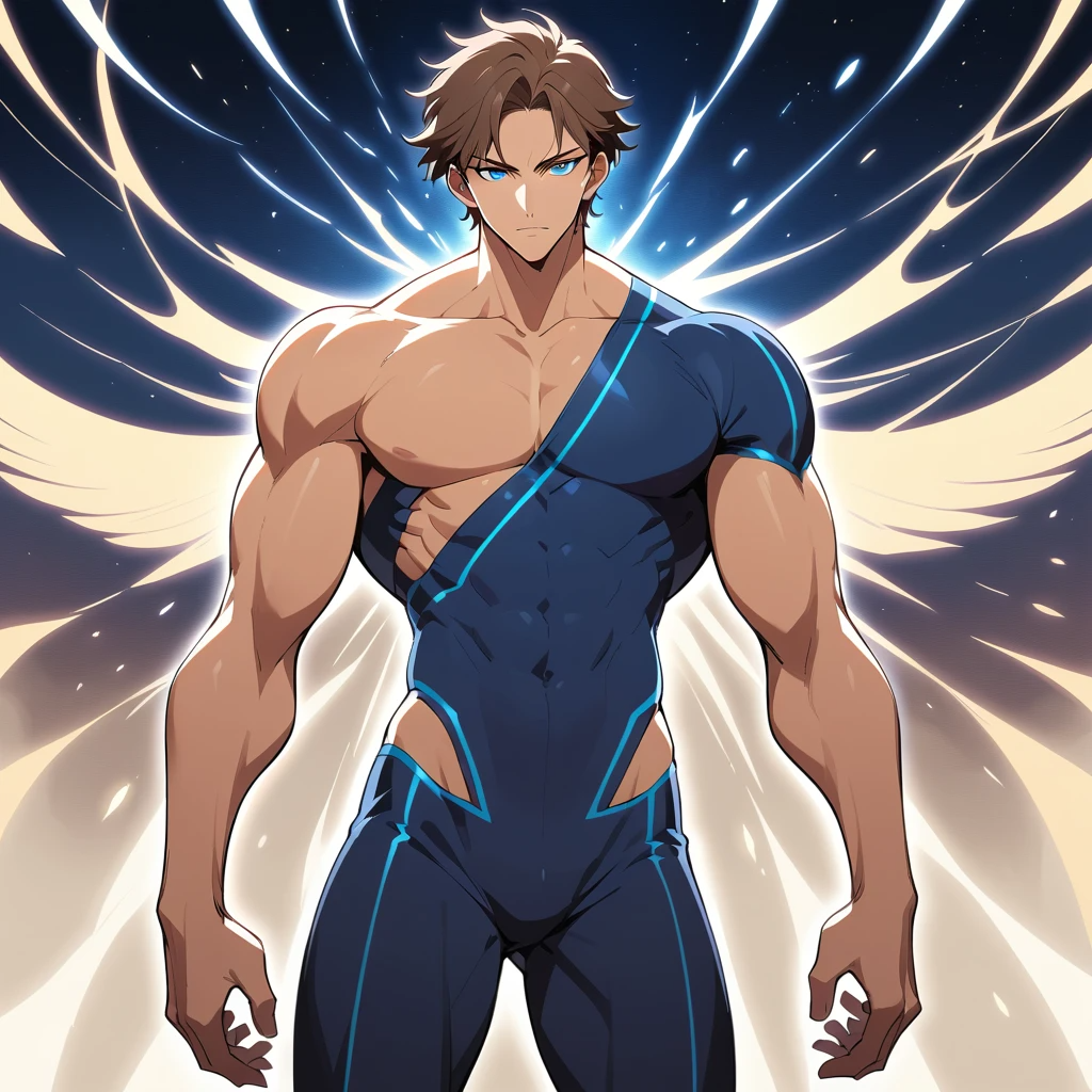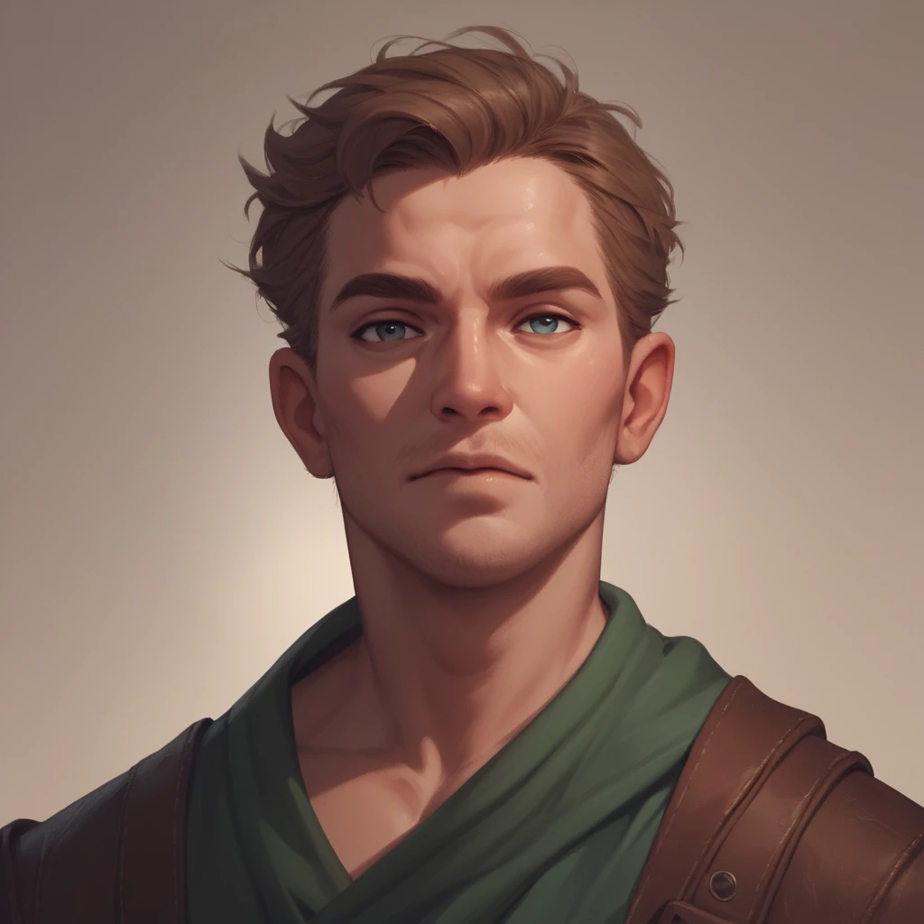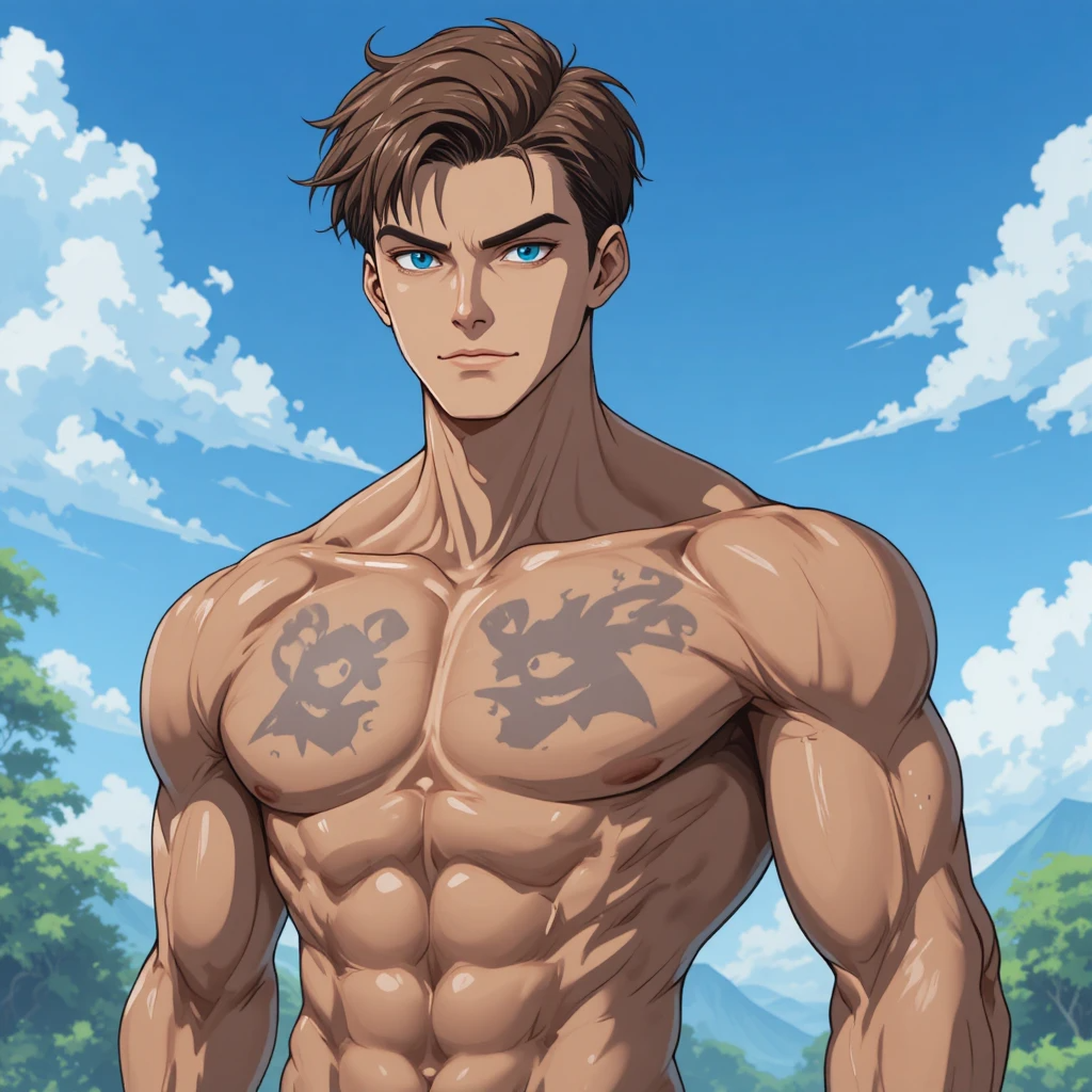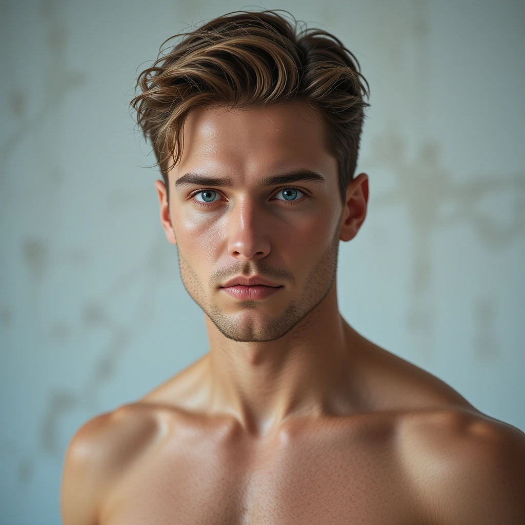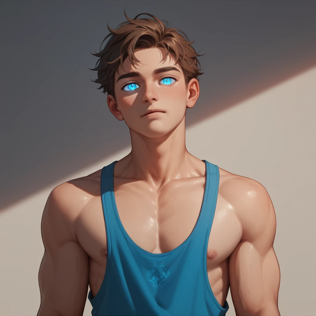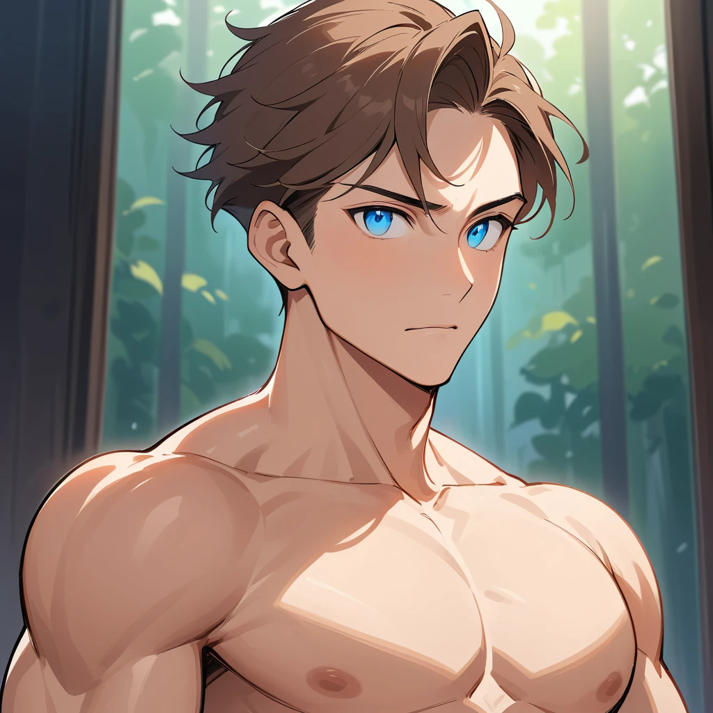 высокий поджарый мускулистый стройный молодой мужчина лет тридцати с каштановыми короткими волосами и прозрачными синими глазами