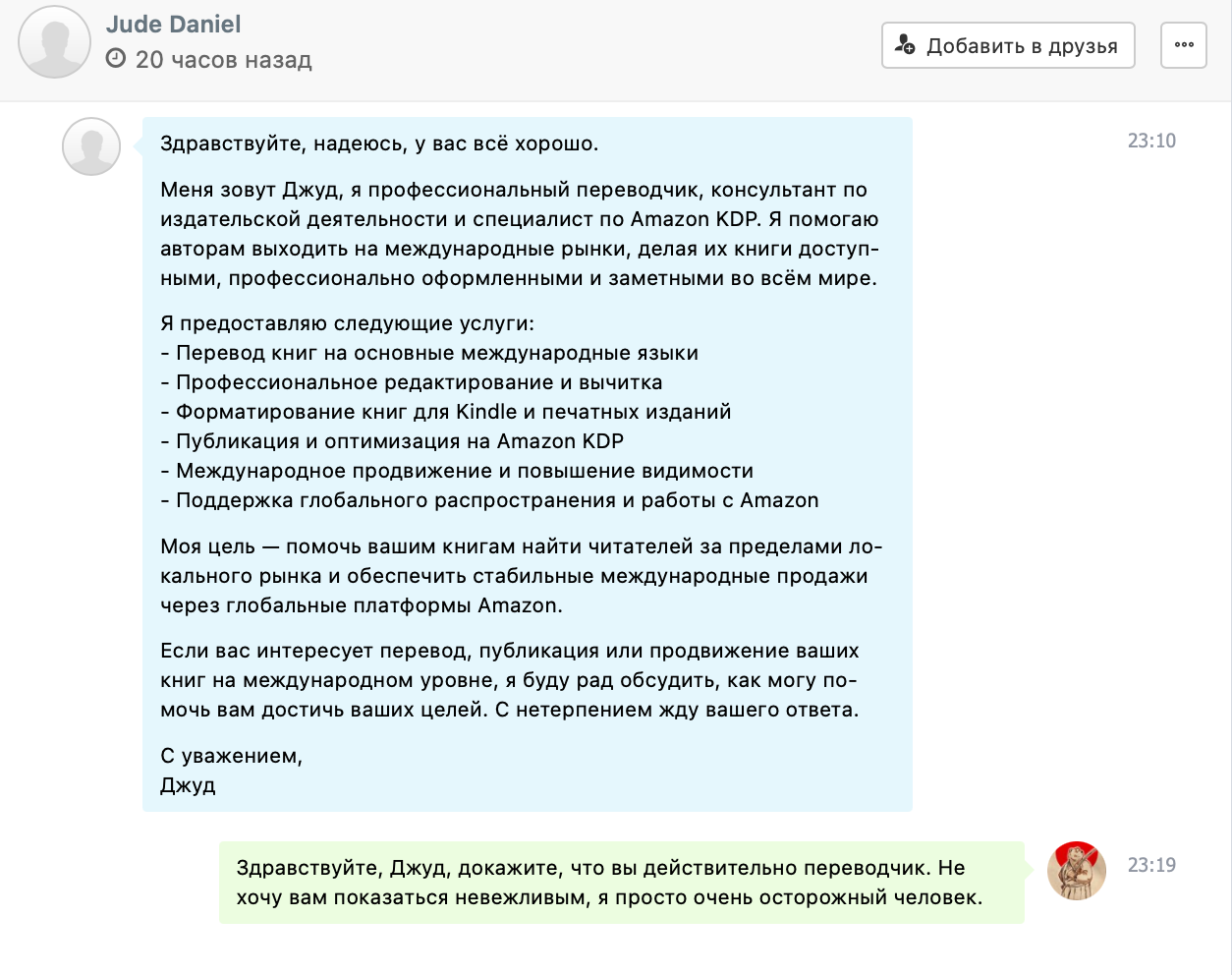"Здравствуйте, Джуд, докажите, что вы действительно переводчик. Не хочу показаться невежливым, я просто очень осторожный человек."