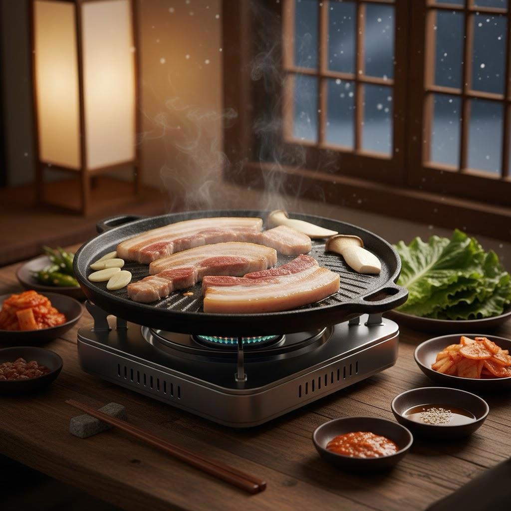 Самгёпсаль — корейское блюдо из свиной грудинки, которую жарят на гриле прямо за столом и едят, заворачивая в листья салата с соусами и гарнирами.