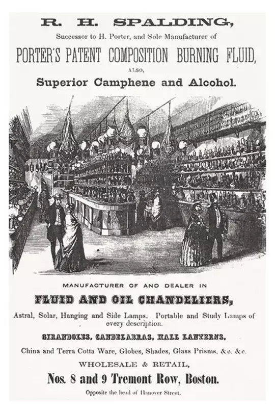Но настоящий полярный писец подкрался с другой стороны. Ушлые янки уже некоторое время пытались заменить китовый жир всякими смесями свиного сала и скипидара. Самый подлый удар нанес в 1835 некий Генри Портер из Бангора, штат Мэн, запатентовавший смесь одной части скипидара, четырёх частей спирта и небольшого количества камфоры для аромата. Именно «Жидкость Портера» стала популярным топливом для ламп. Она ярко горела и приятно пахла, но, как несложно догадаться, высоколетучие пары спиртовой смеси могли бахнуть и так, что мало не покажется.