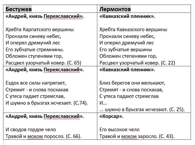 Вы можете сказать: а почему ты вообще решил, что этот образ - Бестужева, а не Лермонтова? Может, Лермонтов ничего у Бестужева и не брал? Может, он эту строчку сам придумал, может, он вообще Бестужева не читал?